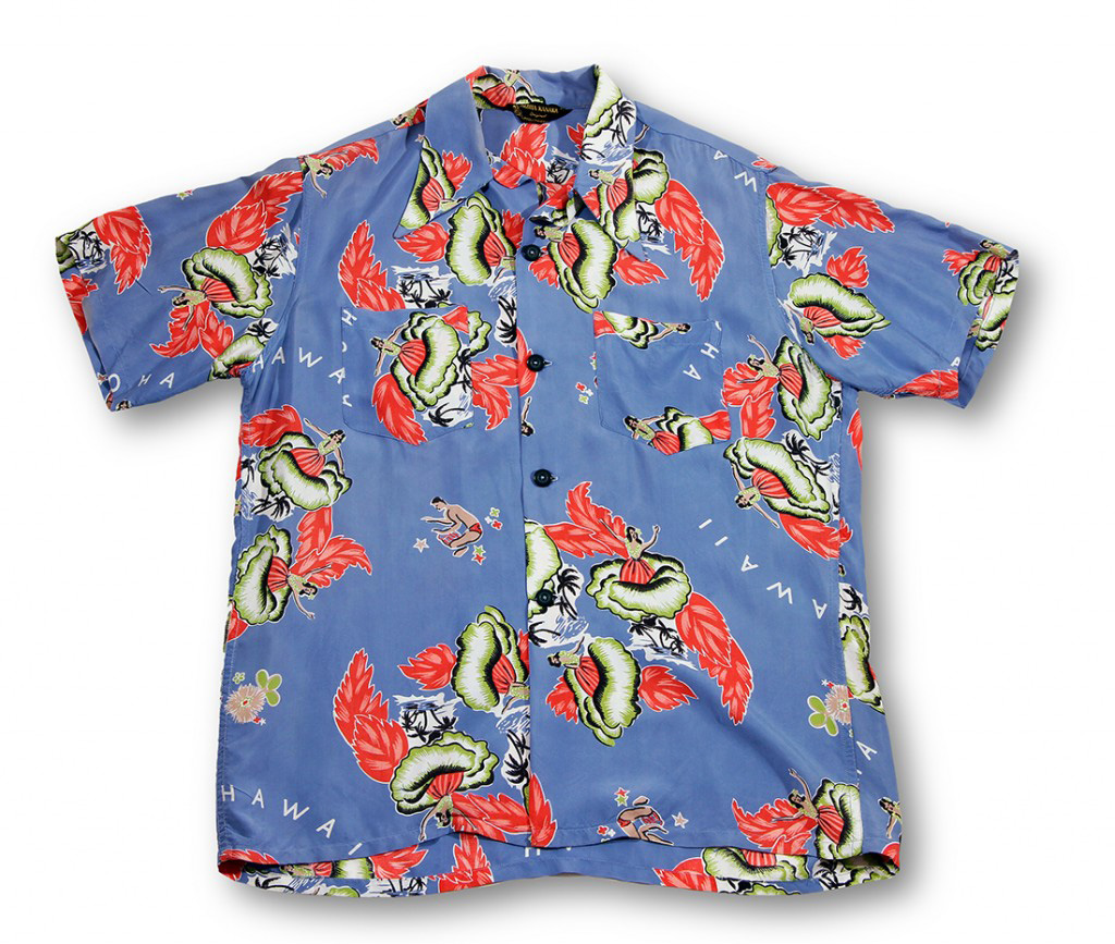 With a stylish four way layout, hula maidens wear a lei and flower behind their ear as they dance on a exotic lime green and navy flower. A lone man plays the drum, surrounded by star flowers and empty space. The word Hawaii and clusters of palms near pools of water add to the tropical feeling that exudes from this shirt. Two chest front pockets.