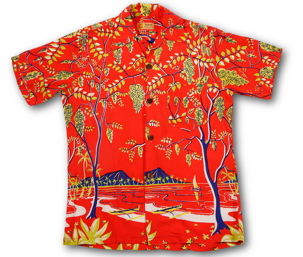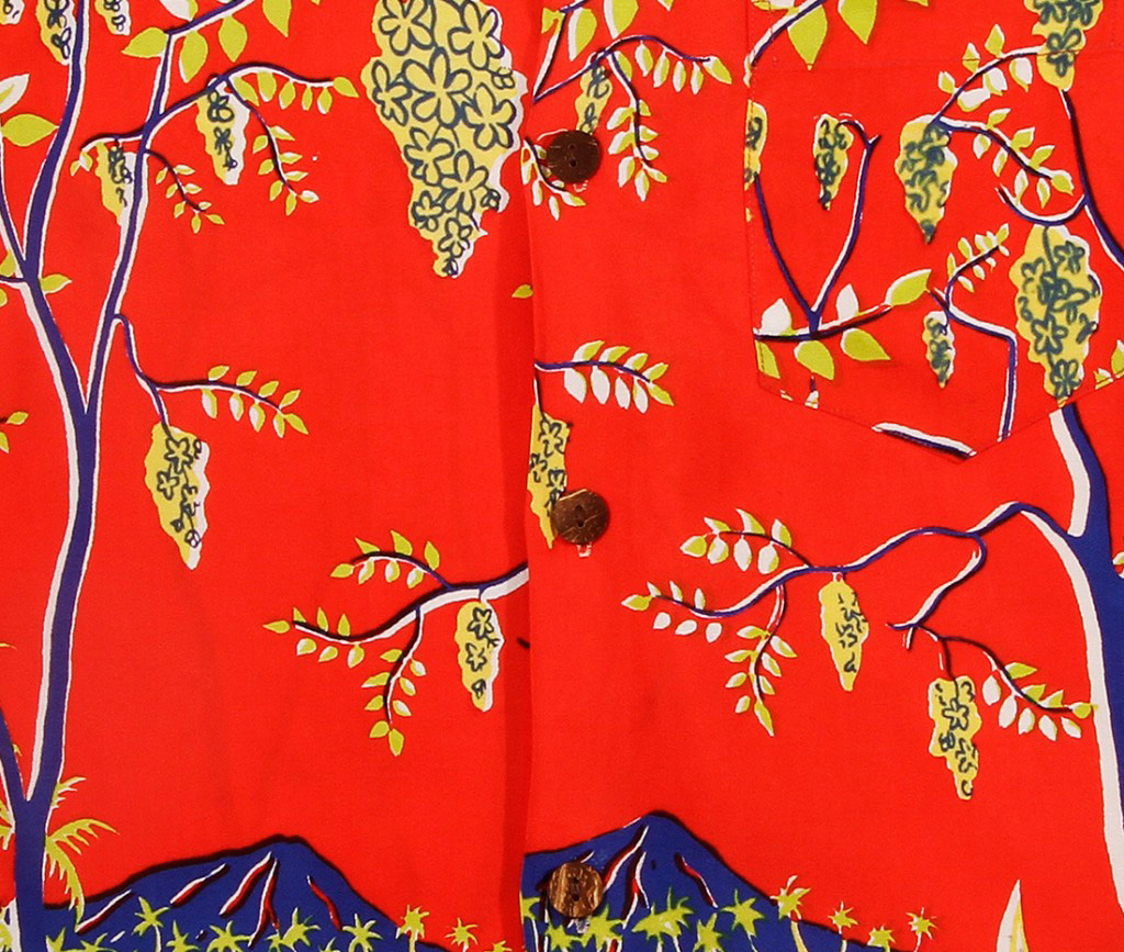 The flowering trees frame Diamond Head and a one-man canoe slowly sailing outside of Waikiki’s slender stretch of magical beach where outrigger canoes await their turn in the surf. Electric orange-red background with royal blue, chartreuse and yellow accents create a most vivid shirt.