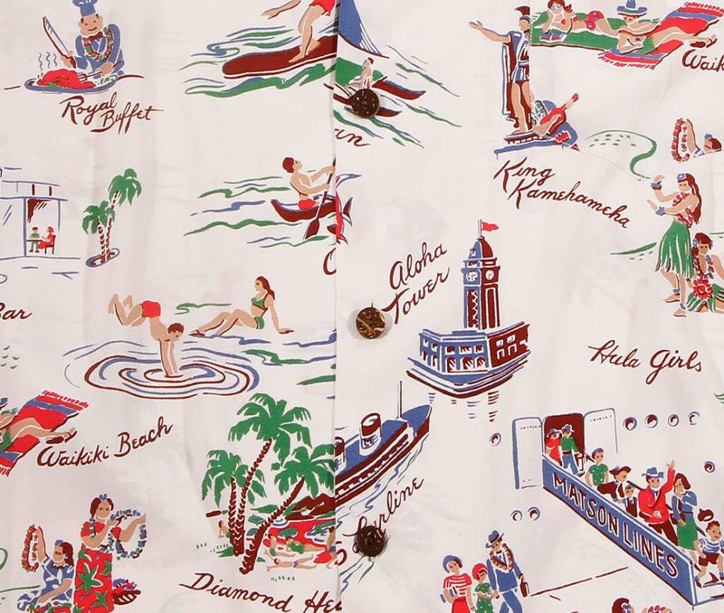 With long sleeves and sharp white ground color, this would have been the ideal dressy Aloha Shirt to wear to dinner at the Royal Hawaiian or Moana hotels– the prestigious grand hotels in Waikiki.
