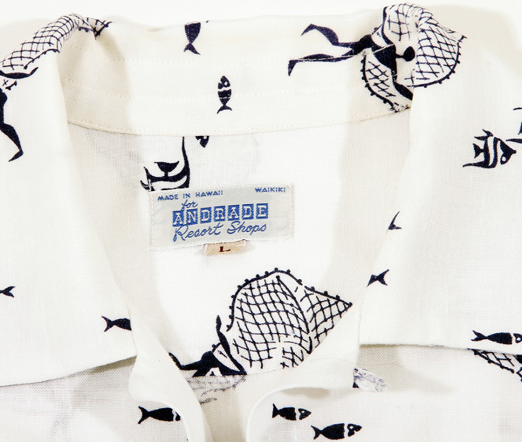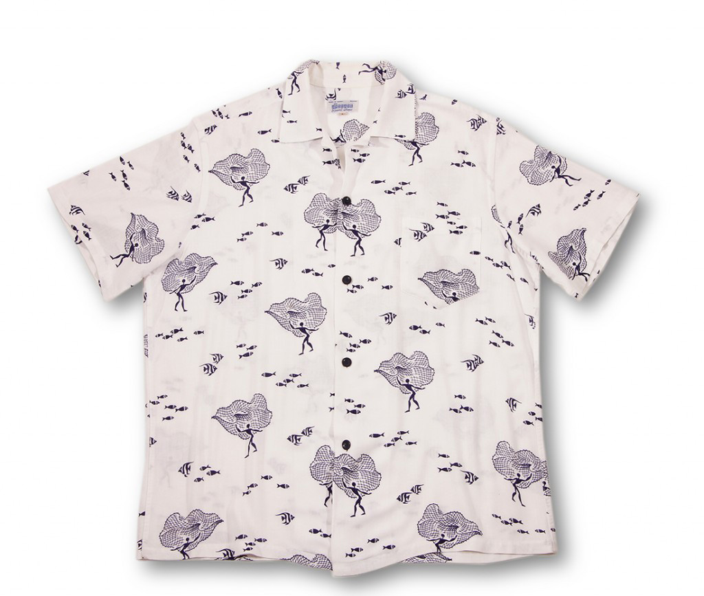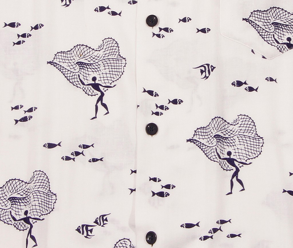 The artist of this shirt created a simple design to commemorate the throw net fisherman, painting simple schools of small reef fish, and silhouettes of the fishermen throwing nets to the right and to the left, balancing the print’s activity. Little gestures indicating the lead weights are carefully depicted on each net rim. The large amount of open ground space allows the viewer to appreciate the simplicity of the design while sharing the appreciation for this unique way of fishing that was adapted by skilled Hawaiian fishermen.