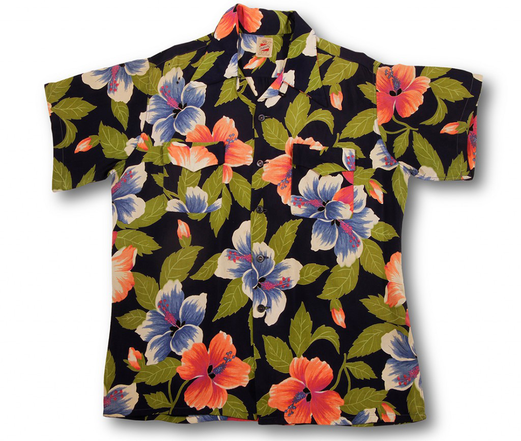 A mix of white hibiscus with shades of blue, and white hibiscus with shades of orange in a balance of green leaves tastefully lay on a solid black background. Laid out as a one-way design, with all the flowers facing upright with only a random bud arching downward. One-way designs take more fabric and cost more to make, but keep the eye engaged with the elements, providing a more elegant shirt. Two flap pockets.