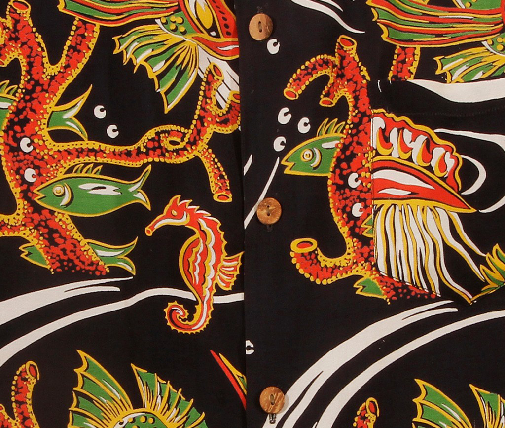 One wonders is these Jules Verne creatures could have been created by the renowned textile artist John “Keoni” Meigs. He created and sold nearly 300 textile designs to the local and mainland garment industries. This print has been seen with a Kahala label, a prestigious shirt maker in Hawaii that started making shirts in 1936 as well as with a Pilgrim label, a mainland company that is known to have bought a lot of “Keoni’s” designs. With the coconut buttons, most likely this shirt was made by Kahala especially for the local retailer located in Waikiki on Kalakaua Ave.