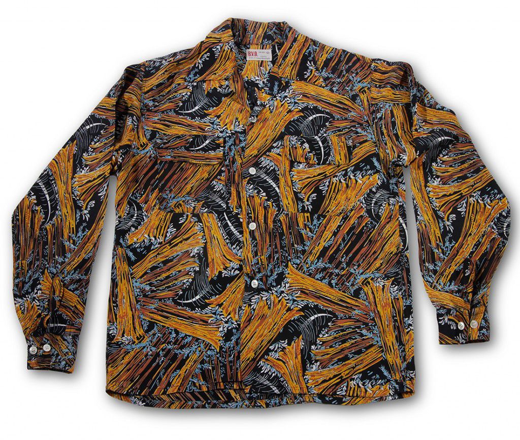 A long-sleeve, double-flap pocket shirt with a very non-Hawaiian print. Inspiration for this design appears to be influenced by a forest found on the Mainland; possibly a redwood grove with the indication of ground cover surrounding the truck bases.