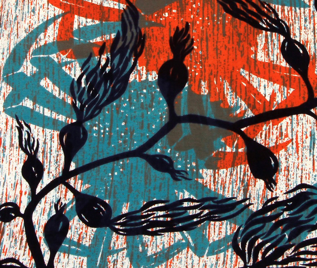 This is all printed on a multi-colored, speckled ground. A stand out design created by an accomplished artist.