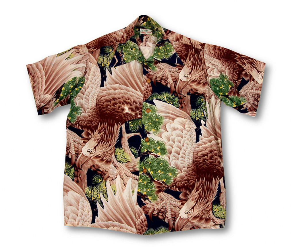 This aloha shirt, made from Japanese kabe crepe for the Cherry Blossom shop in Waikīkī, is incredibly unusual and dynamic in design. At first glance, you’ll likely only see the pattern of brown feathers mixed with the bark of vibrant green Japanese pines. But upon closer look, you’ll see the intense eyes and beak of what could be an ‘io, or Hawaiian hawk, the raptor endemic to Hawai‘i. The textures — the feathers, the pine needles — have so much depth, the images have a modern Japanese woodblock print feel to them.