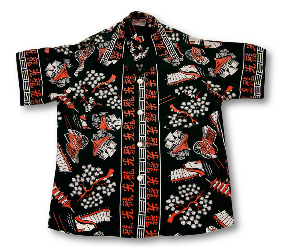 An unusual, well-engineered print with complete Chinese inspiration on this short-sleeved aloha shirt by Coopers. The shirt front is perfectly aligned to allow a repeating linear block motif with Chinese characters on either side referencing a shining dragon, good fortune and good luck. “Chinese Junks,” sturdy sailing vessels known for their high stern and projecting bows with fully battened sails float with rickshaws that were first introduced in China in 1886.