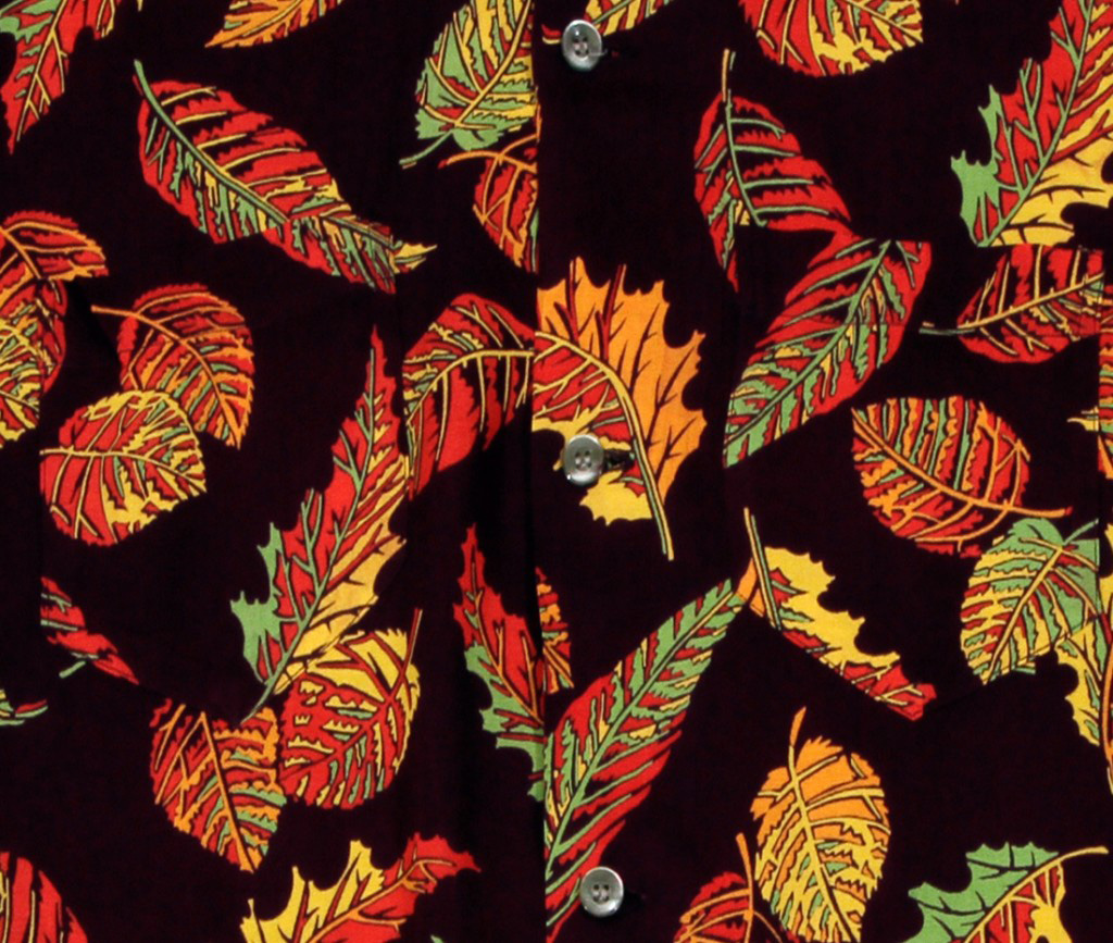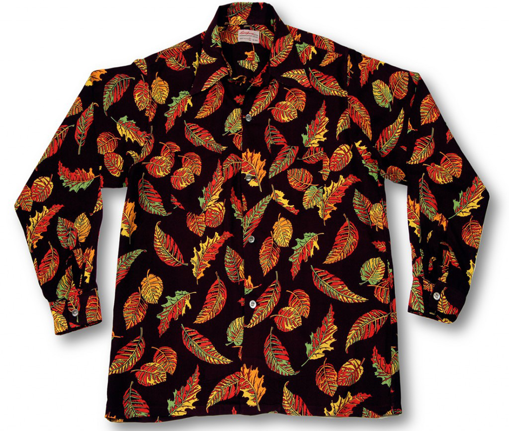 An unusual pattern for a Hawaiian shirt, this long-sleeve Coopers aloha shirt features leaves in their autumn glory. The colors — red, orange, green, gold — jump off the black fabric of this dressy shirt. The design is unusual because this scene — leaves changing color — doesn’t happen in Hawai‘i’s climate.