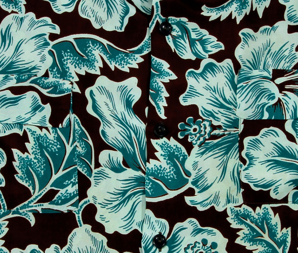 This Del Mar Sportswear aloha shirt takes a familiar print and, using color alone, creates an unique design. The Hawaiian hibiscus — there are seven known species of this flower regarded as native to the Islands — is the focal point of this design. But instead of common colors — red, yellow, pink, white — these flowers are turquoise blue, vibrant against the black shirt, creating a very modern look and feel.