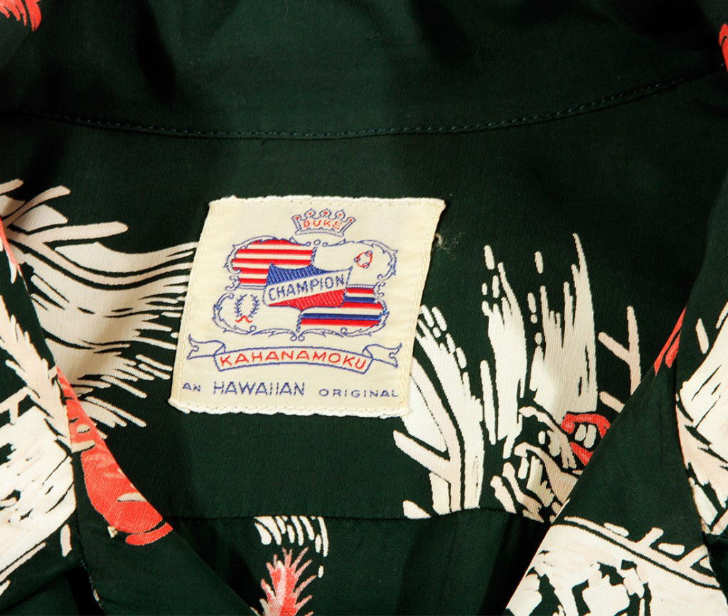 Named “Kailua Races” this tropical horse-race design was created in 1950. The Duke Kahanamoku Champion collection for Cisco hang tag read: “Designed in Hawaii by famous Duke Kahanamoku. Authentic island patterns on fine quality washable rayon, tailored with an eye for detail.”