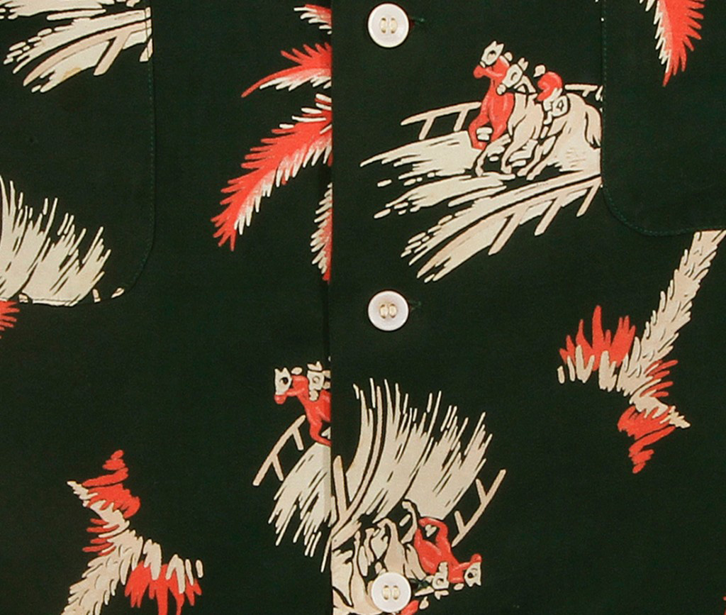 A four-way design with horses racing in all directions under a lone palm tree on a midnight green ground. This longed sleeve shirt was ideal for a day at the Southern California Del Mar race track in the early 1950’s.