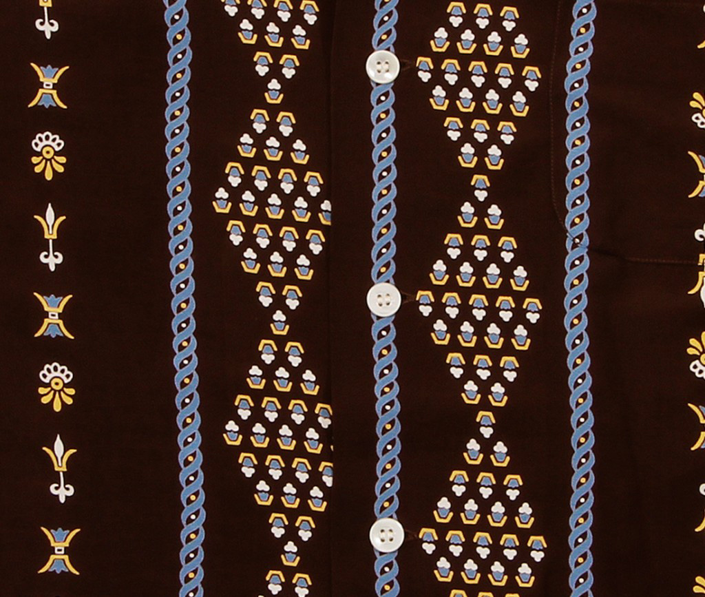 This intricate geometric design runs up and down this short-sleeved shirt. The purple, gold and white details pop against the black fabric. A purple rope separates the small patterns in shapes like circles, polygons and stylized floral designs.
