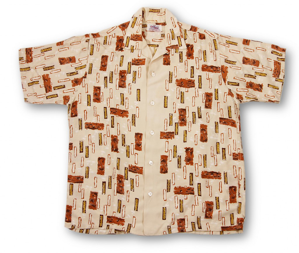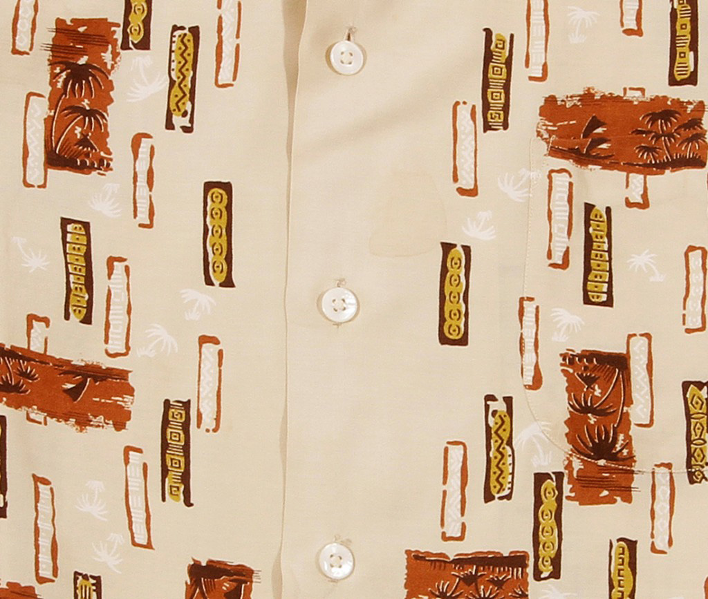 This geometric engineered shirt has a solid vertical gap running along the shirt front. Little white coconut tree motifs subtly dot the background, rectangles of tapa markings in various colors, and larger motifs with huts, coconut trees and canoes in shades of brown combine to create this easy to wear shirt.