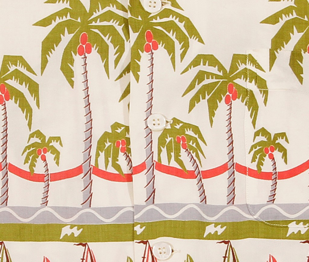 This border print, with perfectly matched horizontal stripes, was influenced by tropical Florida, Aztec images and a bit of Hawaii. Palm trees, sailboats, pineapple and huts mix with more abstract tribal designs.