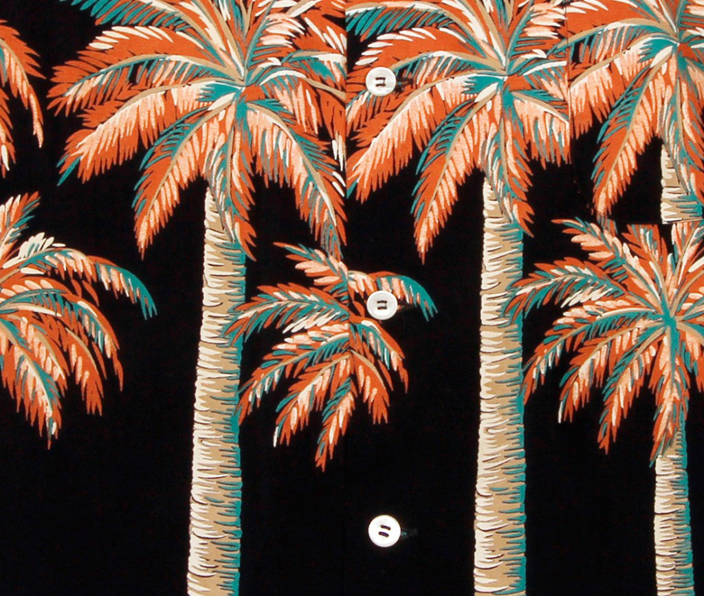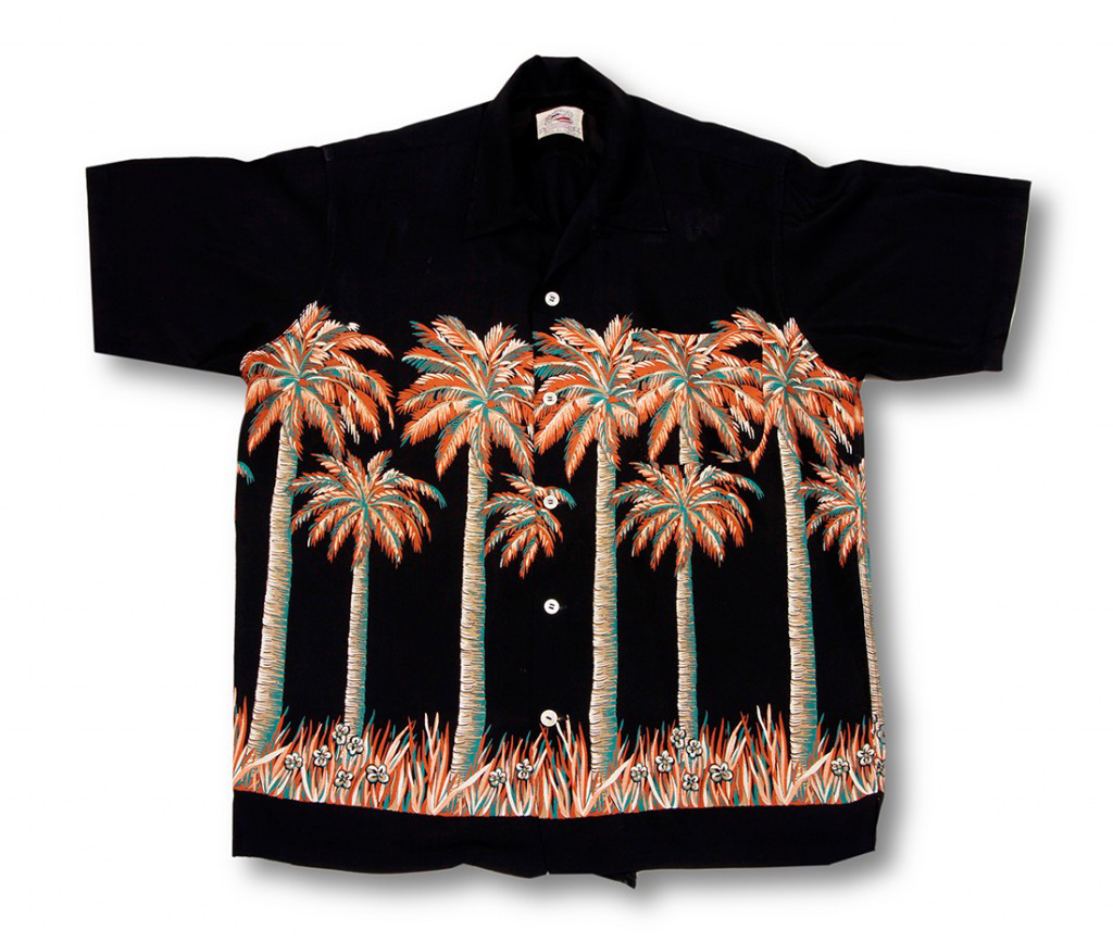 These straight and tall California palms on a black background create a stunning and simple shirt. The black band on the bottom of the shirt and the all black sleeves create a dramatic look.