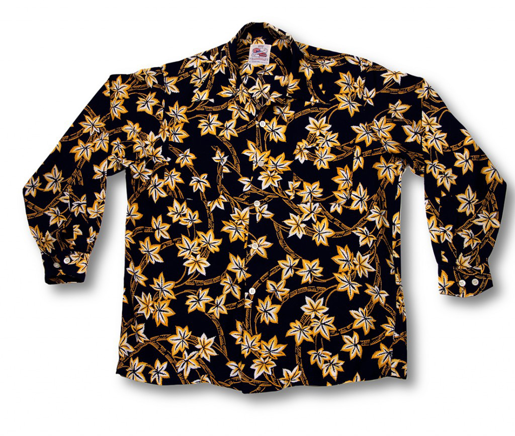 This long-sleeved aloha shirt was the answer to any dressy or formal occasion in Hawai‘i. Out of the jet black fabric jumps out stylized golden maple leaves. These kōyō (literally means “red leaves”) are to the Japanese autumn what sakura (cherry blossoms) are to spring. The viewing of autumn leaves, called momiji-gari, is hugely popular in Japan and lures thousands of visitors to spots in the mountains or at city parks. This shirt honors this fleeting seasonal change, something not seen in the Islands.