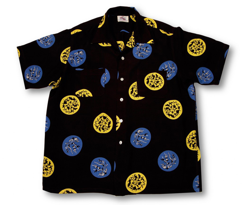 This black, short-sleeved shirt features an Asian-inspired motif paired with a Hawaiian design: blue and gold circles with different limu (seaweed) renderings inside. (Sadly, one of the sea plants looks invasive.) The black backdrop makes these designs vibrant and dynamic.