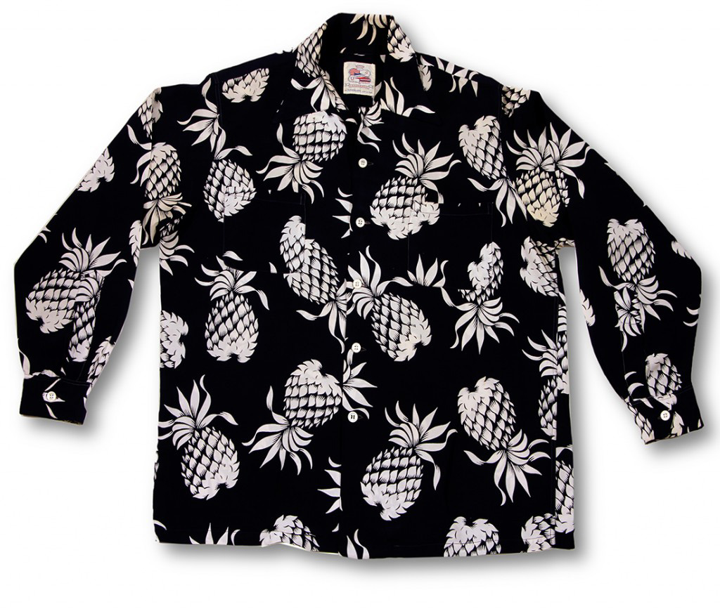 Out of a deep midnight navy ground, jump grenade-like, stylized art deco pineapples. They created a two-way print where the pineapples were either facing down or up. To accompany the long sleeves, a breast pocket was added to the right shirt front.