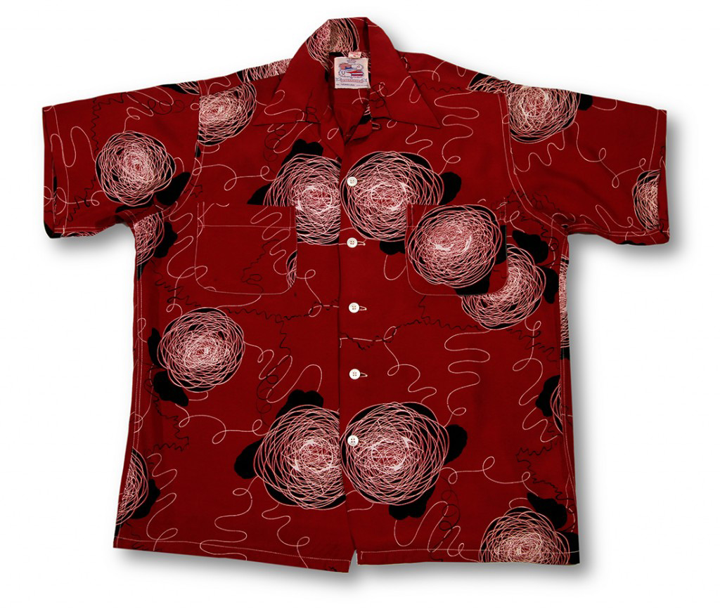 This is an unusual design with abstract pencil-like scribbles and black blobs on a red background. Duke wore the Cisco Duke Kahanamoku shirts exclusively while his agreement was in force, but we have never seen him wearing this shirt. Duke favored the shirts that were inspired by Hawaii and all her beauty.