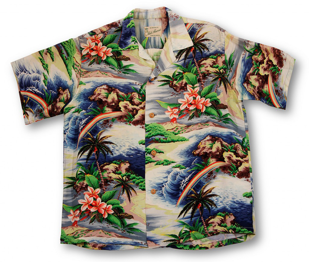 Wah Cho (W.C.) Lock was the owner of the well-known company, Hale Hawaii, “House of the Sun” which he started in 1947. He concentrated on Hawaiian print shirts and worked together with great artists to create his original and unique designs. He told a newspaper reporter once, “And the gayer the colors the better.”