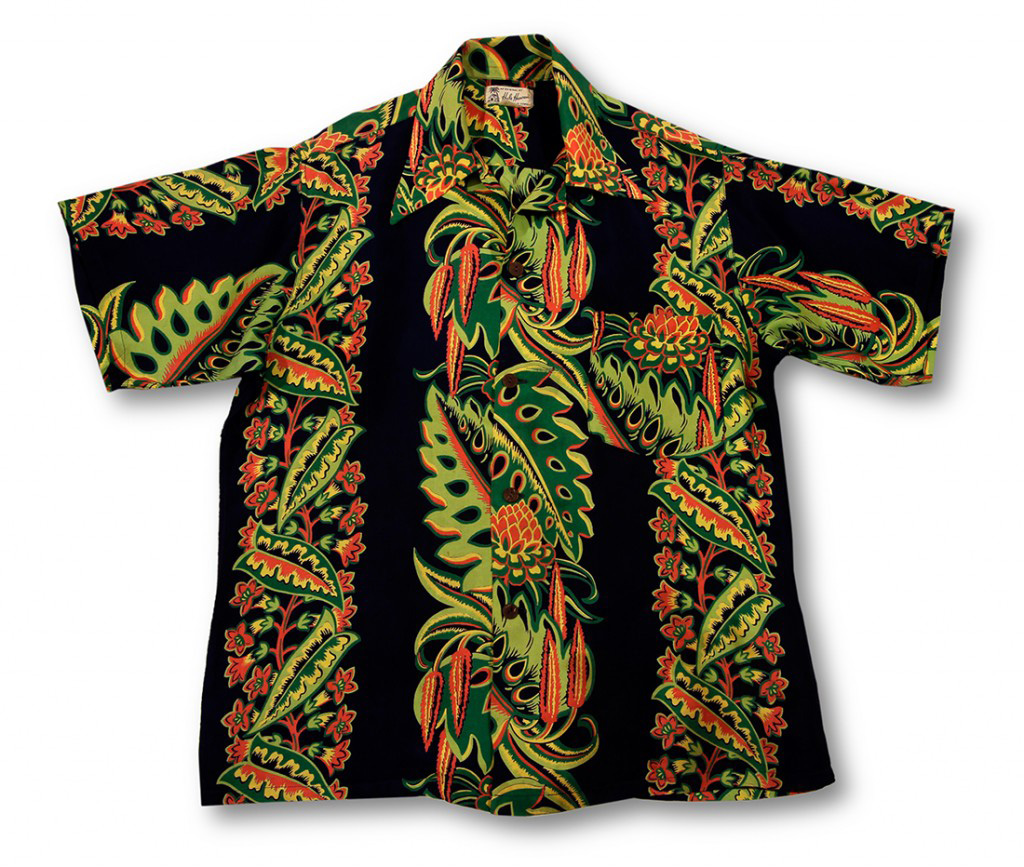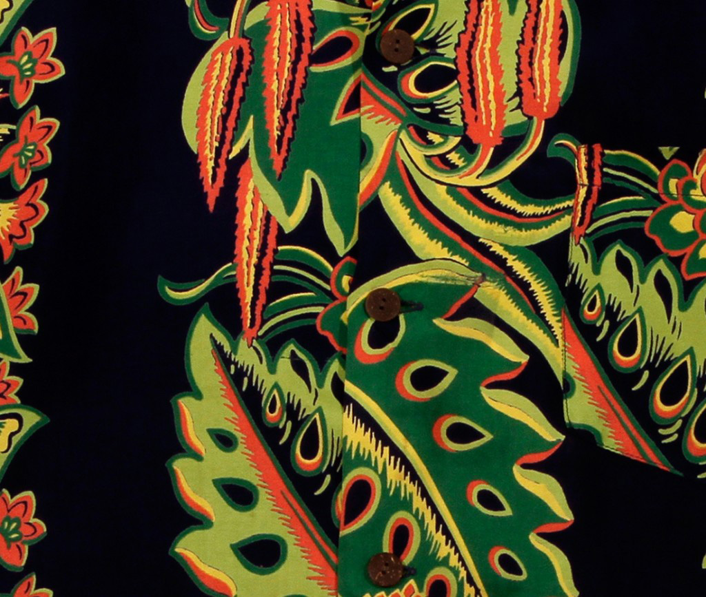 This dynamic short-sleeved aloha shirt by Hale Hawaii is typical of the style of owner Wah Cho Lock. His relationship with hand-screen printers in Japan resulted in these brilliant designs found nowhere else. Bright green monstera leaves with red and yellow protea designs dominate the front of the shirt. Running alongside that vertical design are smaller red flowers and green and yellow leaves, the neon-bright colors popping off the black fabric of the shirt.