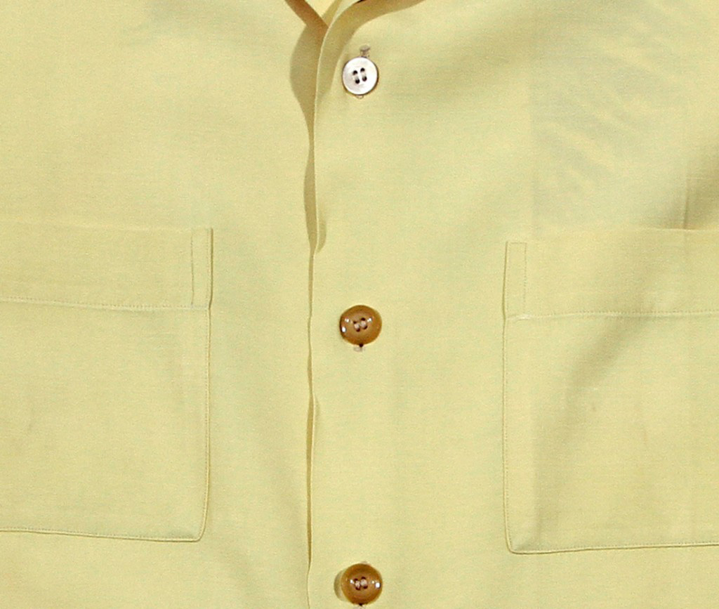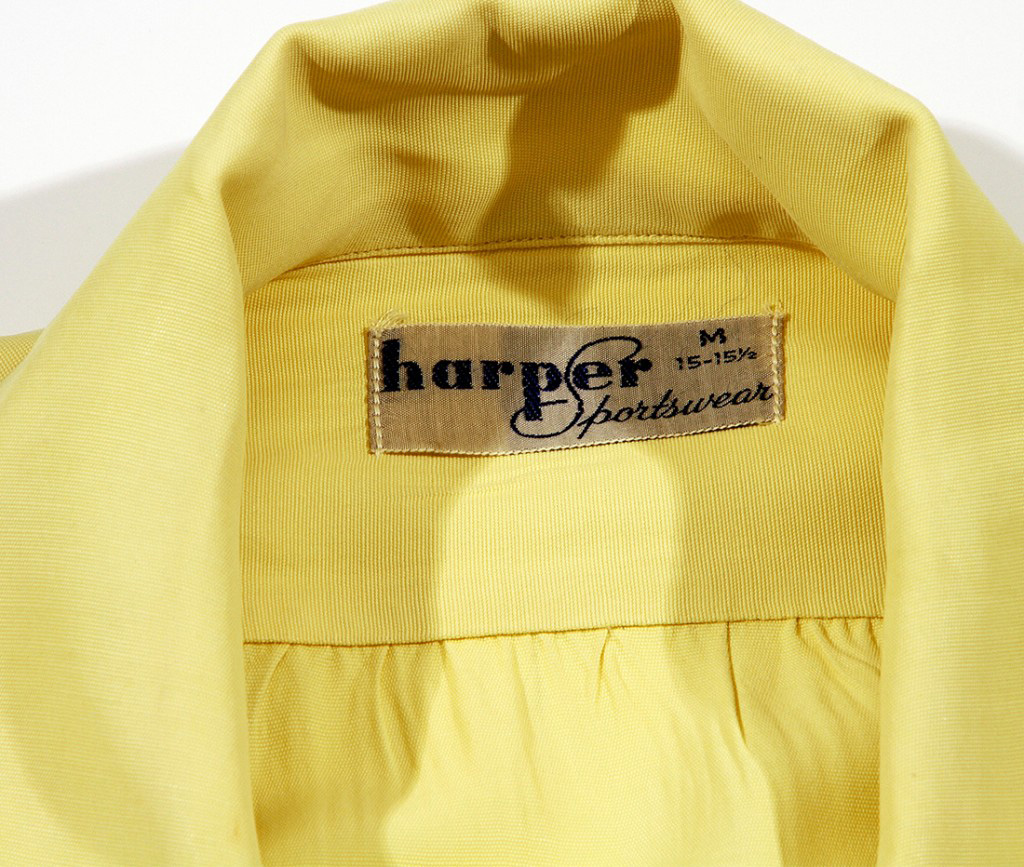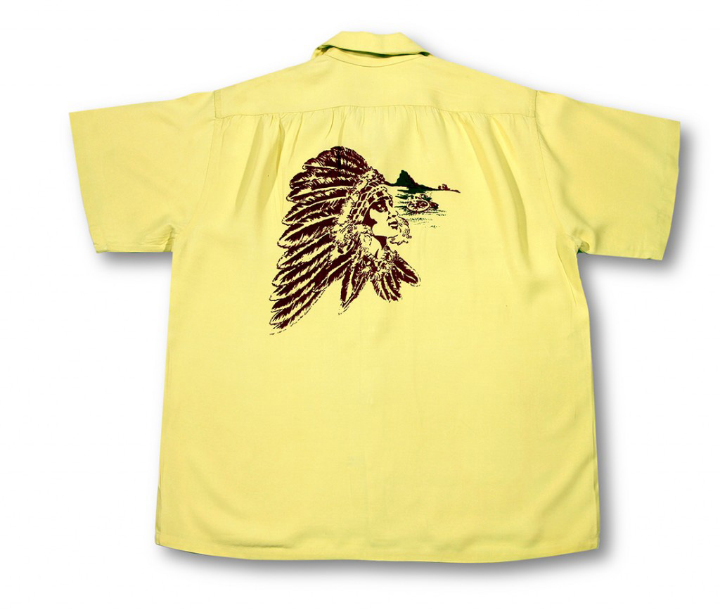 This 1950s shirt is similar to those designed by Catalina with striking front and back hand screened thematic graphic prints. This is a great image of a Native American with a headdress similar to one Sitting Bull would have worn. Aging pieces of a stagecoach wheel lay on the barren ground in the distance.