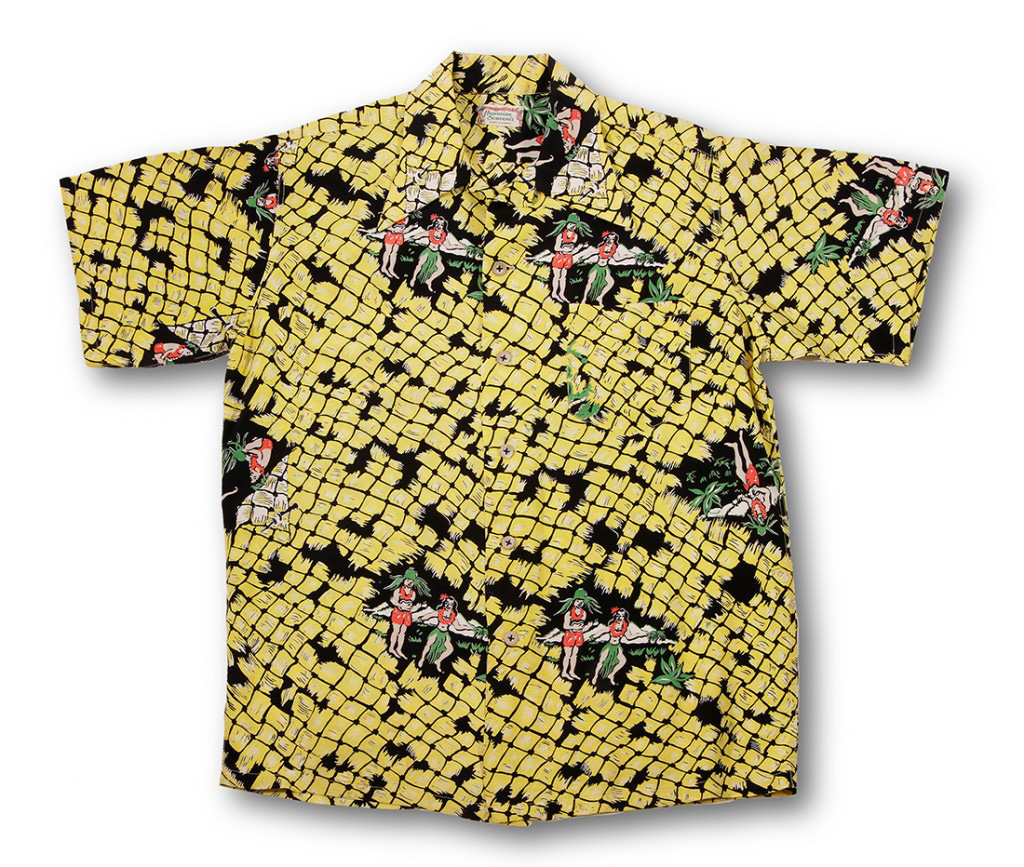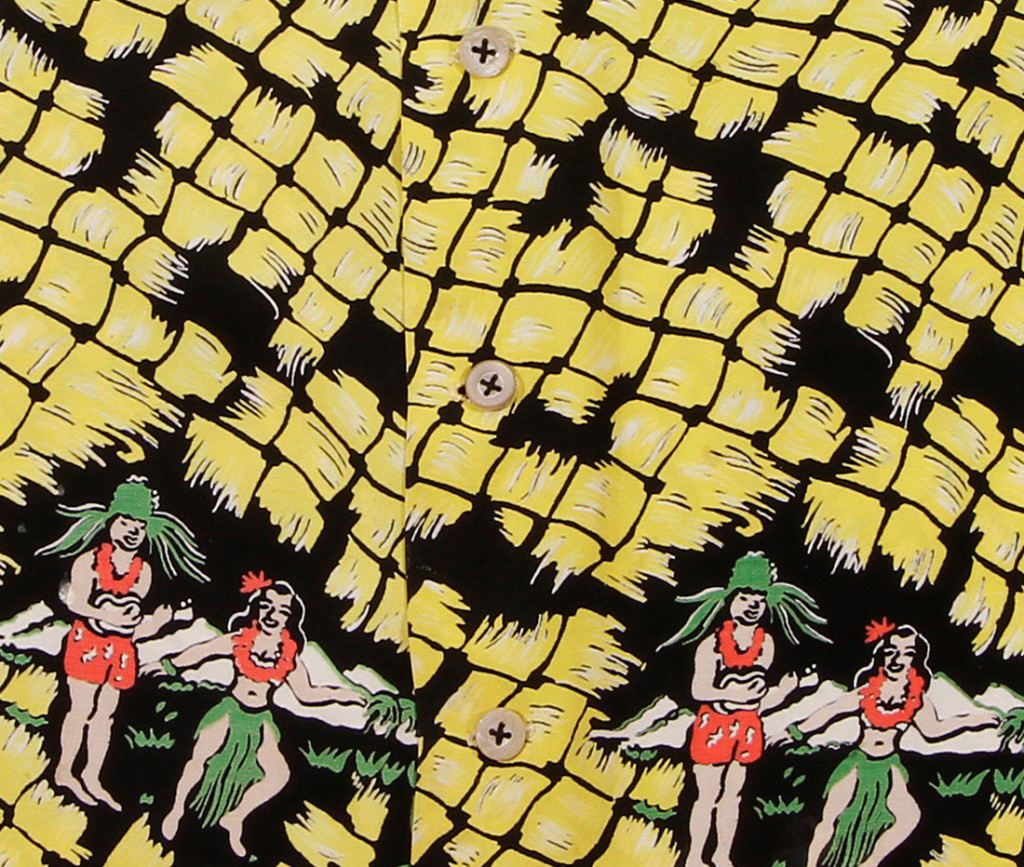 There are large spaces of ground in this pattern, and the image of the couple is repeated sparsely. Refereed to as a “two way” print, this helped to get the best fabric utilization in the cutting room, efficient and cost effective.