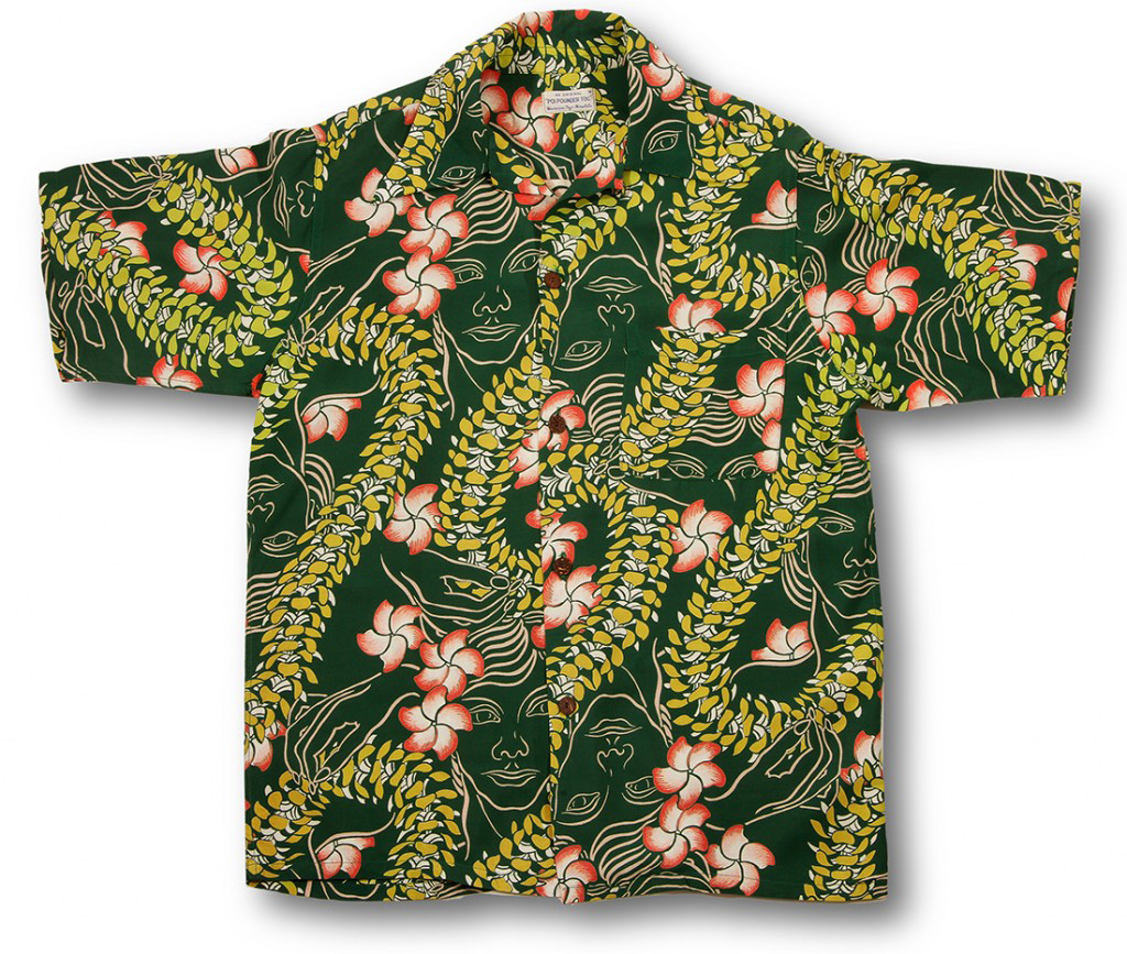 Two color dimensional plumeria lei flow around the silhouettes of carefully drawn, beautiful island women. Here and there an occasional feminine hand touches a lei. This is a “two way” print, with the images flipping up and down. With opposite heads side by side, this makes for an interesting design.