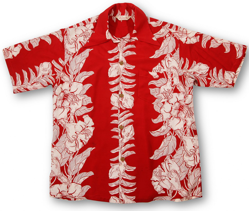 This two-color, vertical-engineered print of a flower lei running down the side panels of this short-sleeved aloha shirt is an iconic design for Hawaiian Togs, a small O‘ahu-based aloha shirt company. The flowers and leaves are white and gray, dramatic against the red fabric of the shirt. Down the front of the shirt and across the sleeves are the same flowers but in bud form.