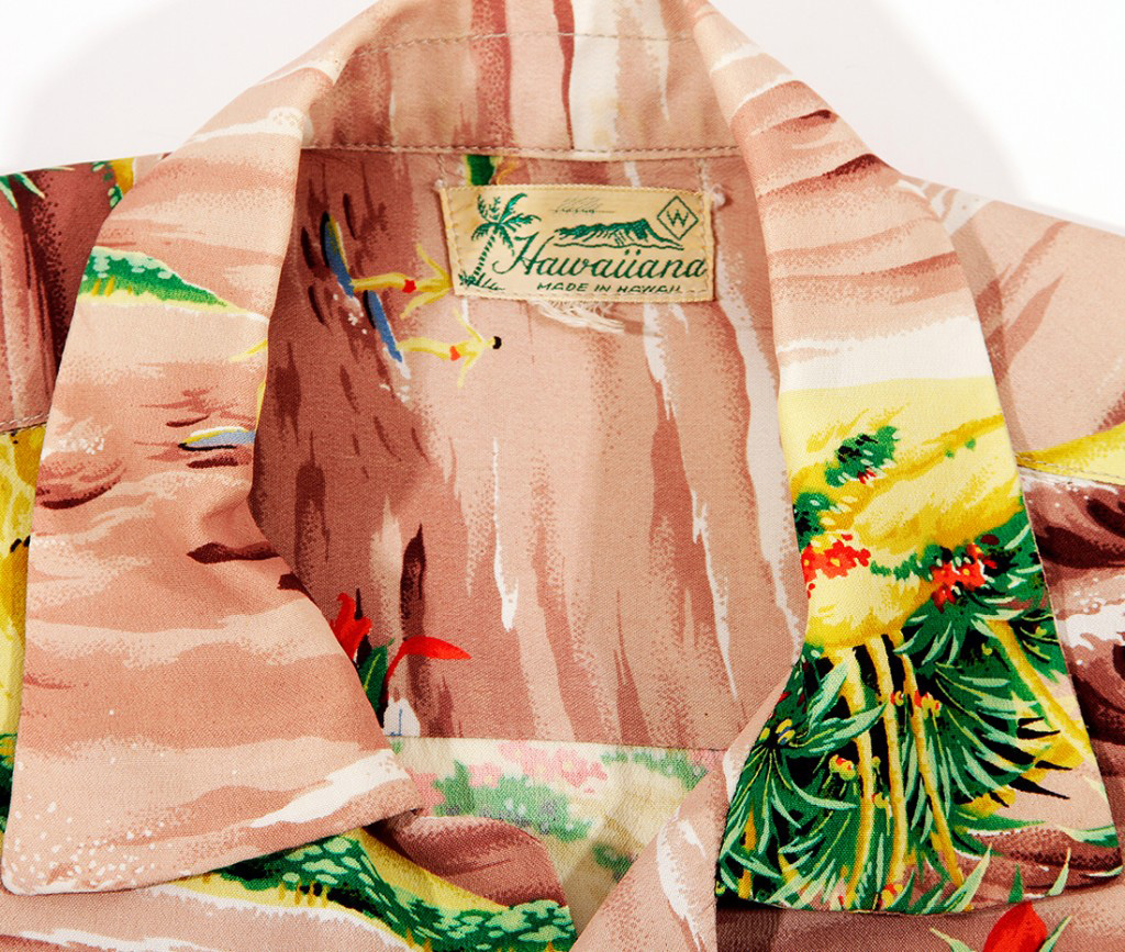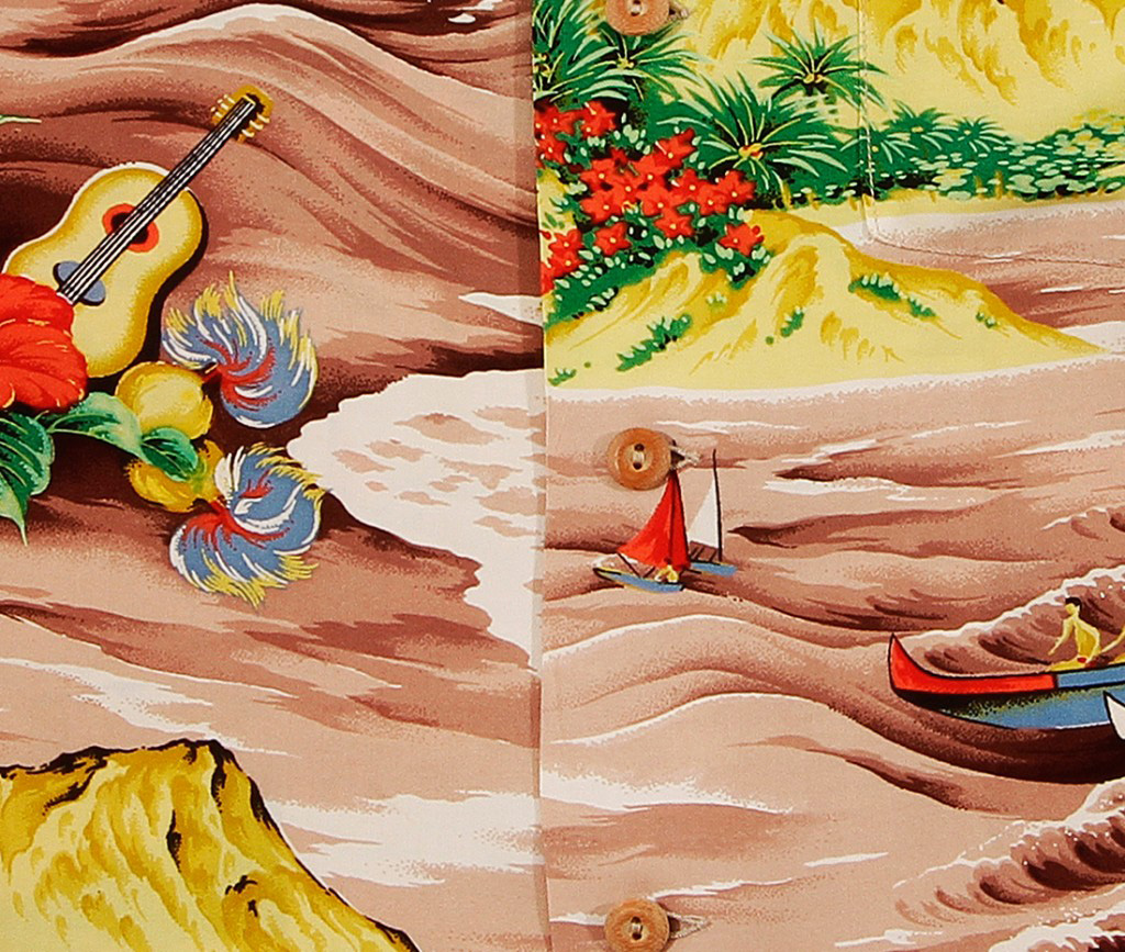 A classic shirt that looks as fresh as the day it was made. Large Koa canoes surf the swells off secluded Waikiki. Surfers ride to shore on long surfboards, as two small sailboats leave the beach.