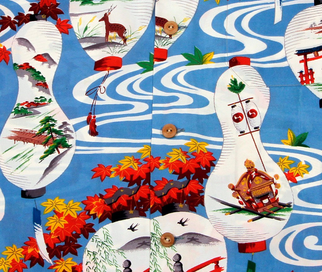 This short-sleeved aloha shirt by Hookano is nod toward the Asian-inspired prints and fabrics that were popular in the ’30s, when tourism to Hawai‘i was booming. The patterns of these shirts depicted many different Asian symbols, from the pheonix that represented long life to tigers that symbolized courage and strength. This shirt features paper lanterns, each depicting a different scene. One shows a torii, a traditional Japanese gate; another a two-tiered pagoda. One features a mikoshi (palanquin) upon which a shrine’s kami (Shinto deity) is carried during matsuri (festivals). All of these paper lanterns are set against a swirling blue and white backdrop, as if they are floating on a river. Along the way are red, gold and dark purple maple leaves, indicating autumn’s arrival.