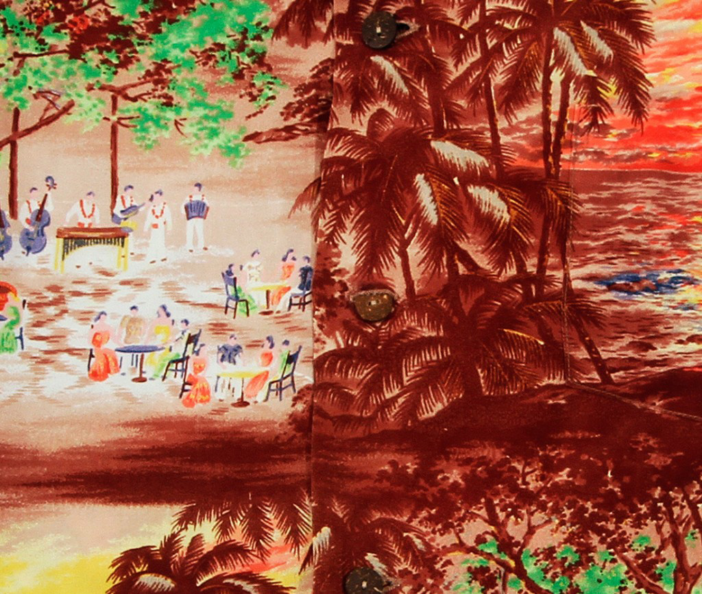 A large commercial prop plane arrives at sunset as beach goers wave aloha. A hand painted print created by an artist in Japan captures the charm under the indian banyan tree in the courtyard at the Waikiki Moana Surfrider Hotel. Hawaiian musicians dressed regally in white with red carnation lei and sashes, play guitar, stand up base, steel guitar, and accordion. Iolani had a similar print theme with the passenger ship Lurline arriving to Oahu with musicians also playing music under the banyan tree on the magic beach at Waikiki.