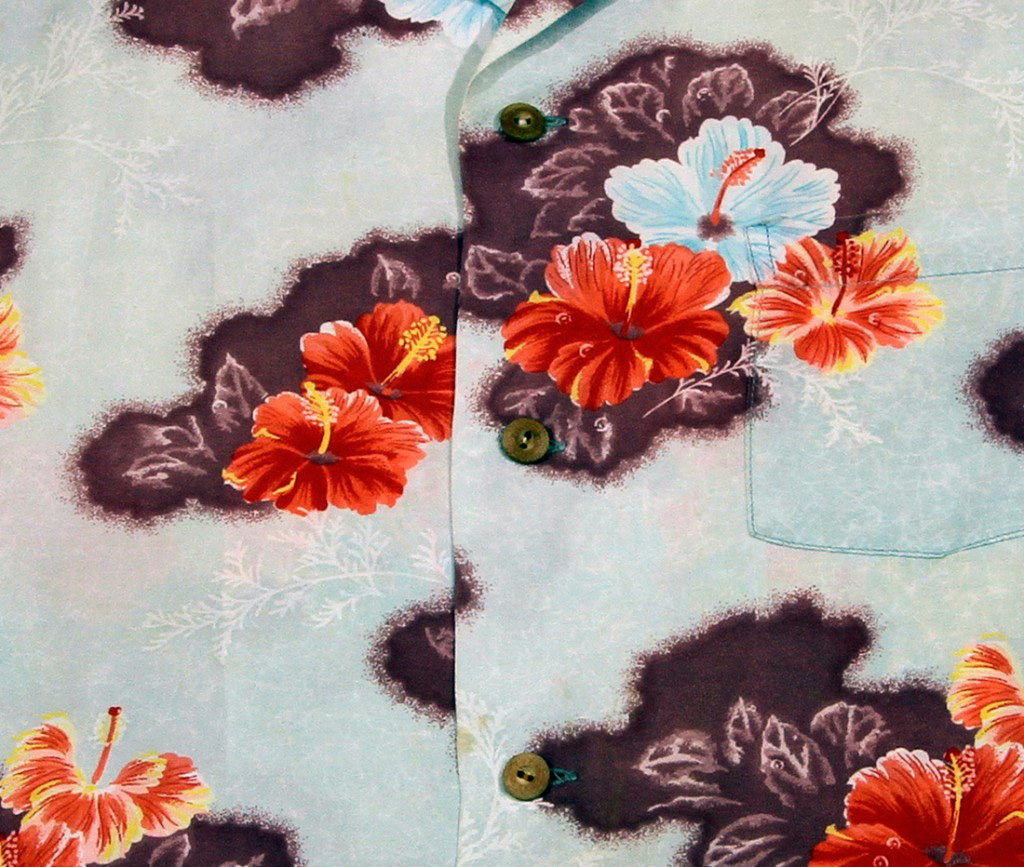 A departure from the scenic, postcard-like designs for which Iolani was known, this short-sleeved aloha shirt still has all the trappings of the company’s look and feel: beautiful hand-painted prints on Japanese kabe crepe fabric. This shirt features red and light blue hibiscus clusters against an icy blue backdrop, like these flowers are floating in cold stream waters.