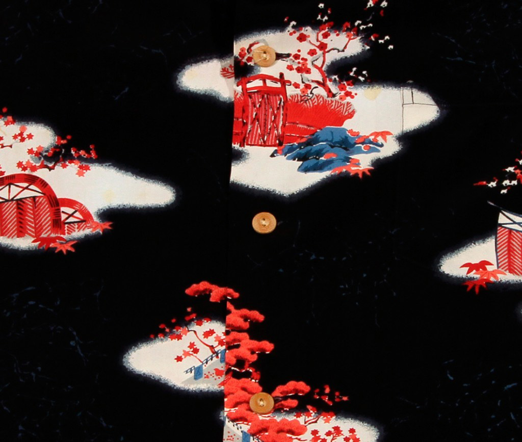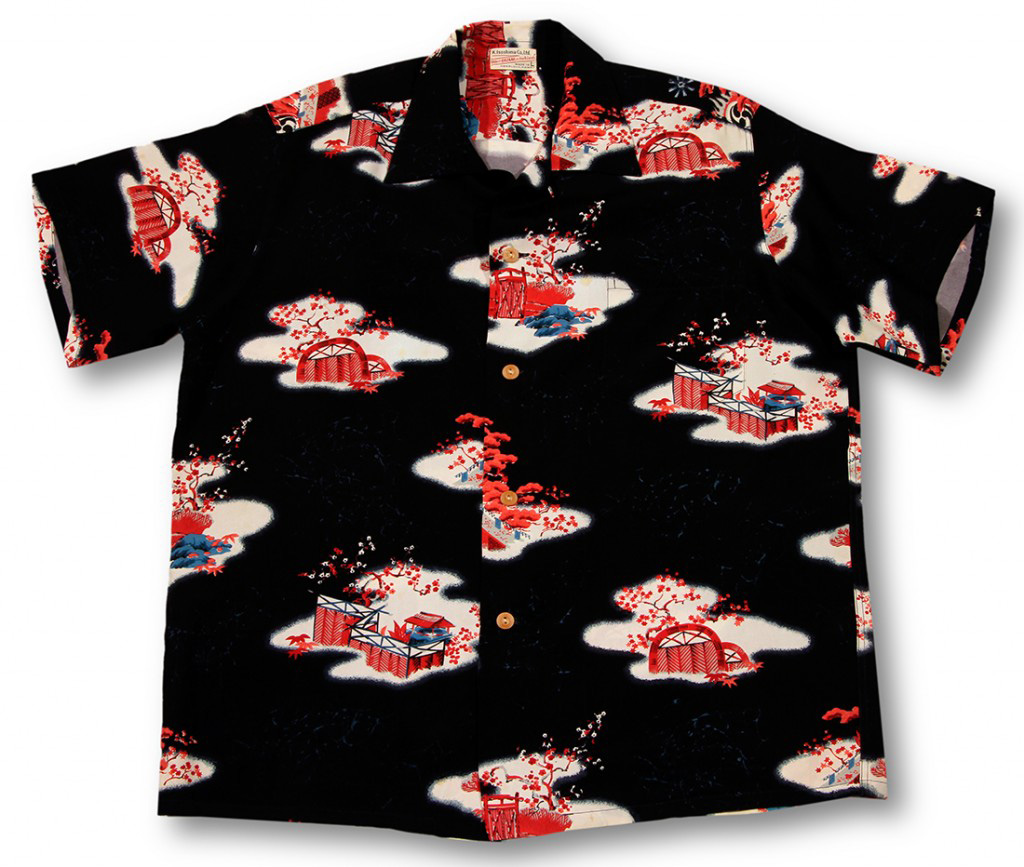 A pioneer of Japanese prints and designs on aloha shirts, K. Isoshima released this three-button shirt featuring quaint scenes of village life during the end of winter. Ume, or plum, trees begin to blossom, indicating the start of spring despite the recent snowfall. The small images of temples, gates, trees and bridges — all in shades of red — are prominent against the black fabric of the shirt.