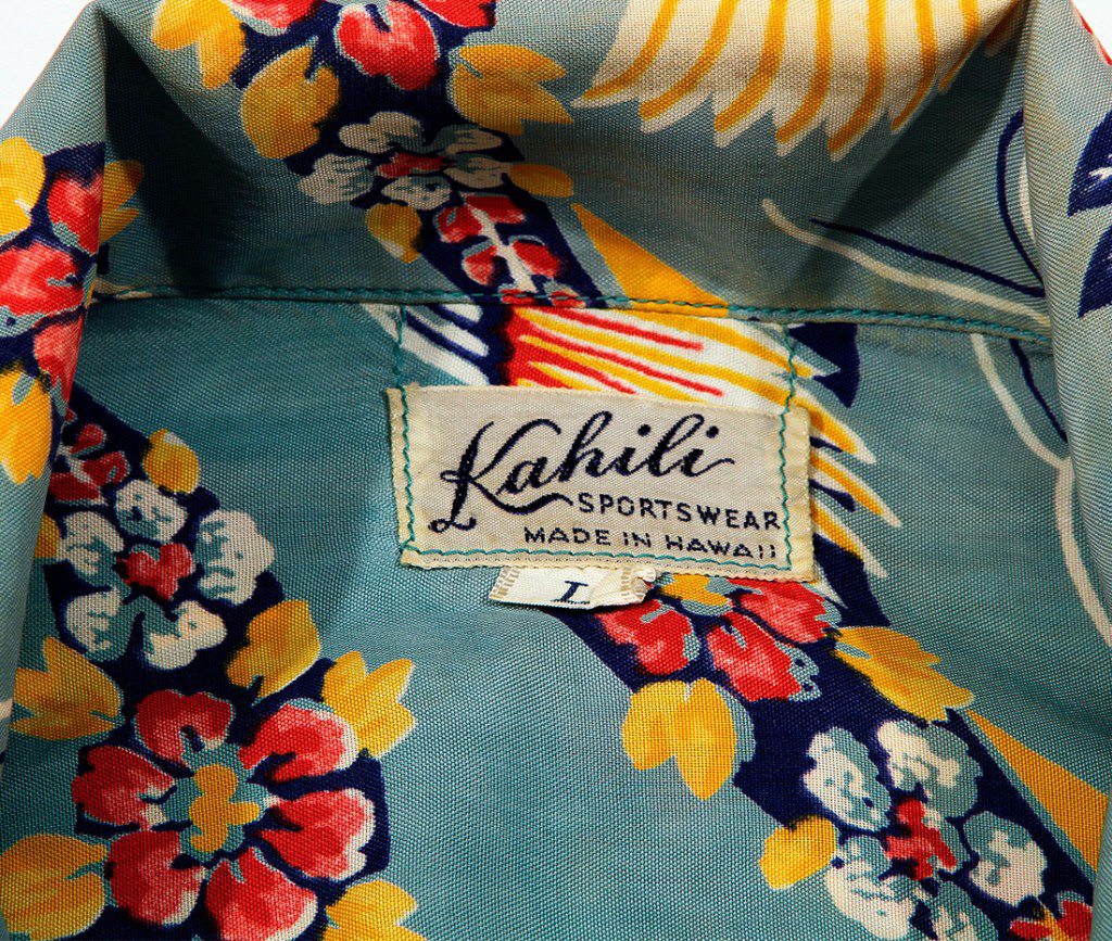 A nod to Asian-inspired aloha shirts popular during this time, this short-sleeved Kahili shirt features colorful tsuru, or Japanese crane. It’s considered a national treasure, appearing in art, literature and folklore. This bird represents good fortune and longevity because of its fabled life span of a thousand years. Connecting the cranes are golden ribbons of red and gold flowers swirling against the periwinkle fabric.