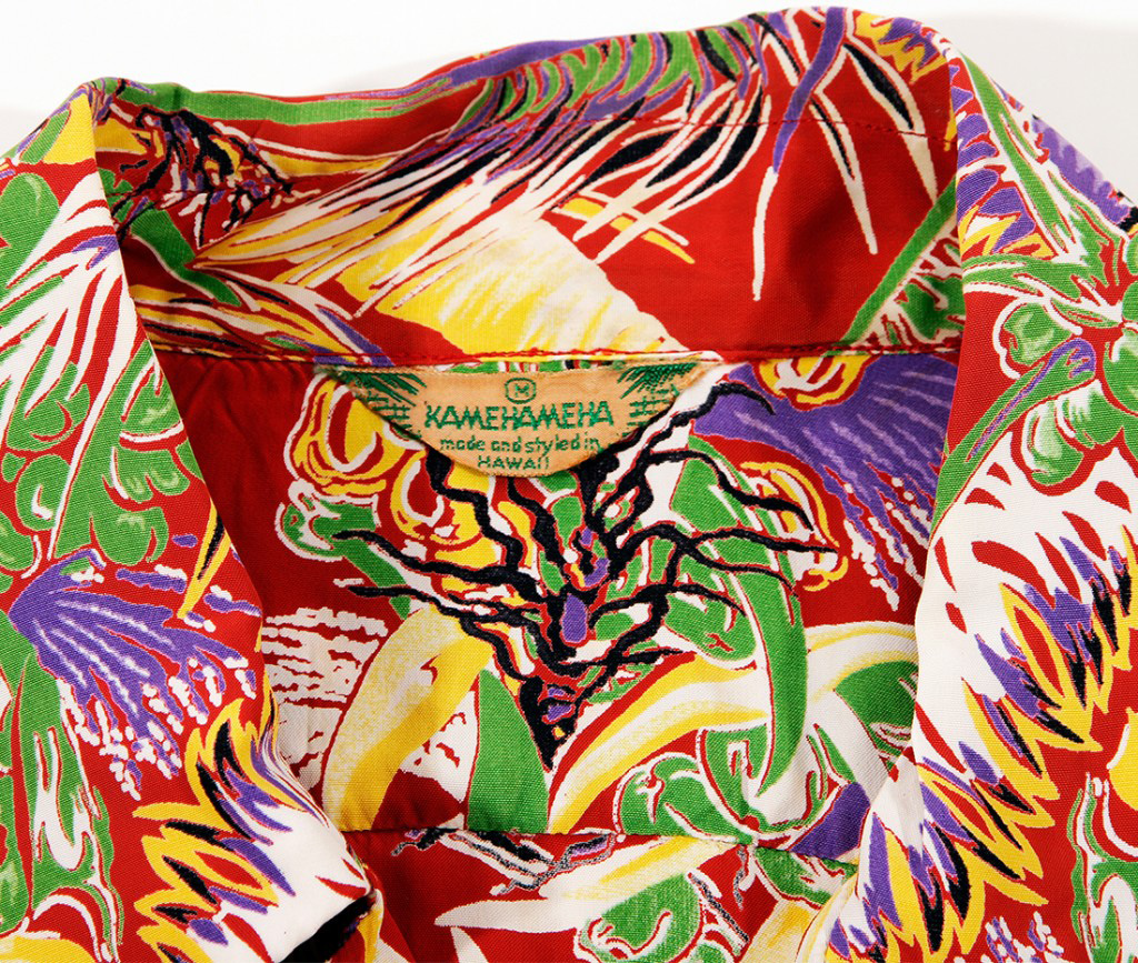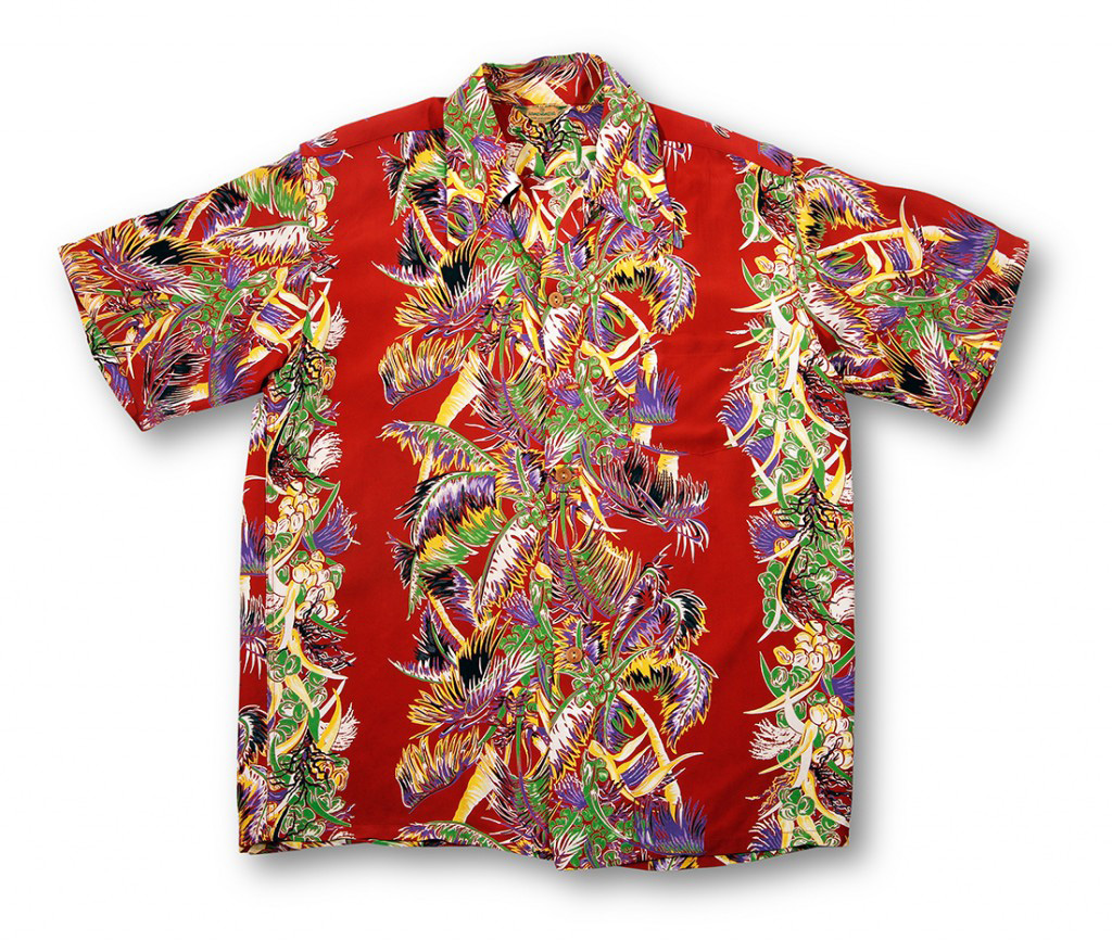 Two rows of coconut tree elements with a solid border separate the larger row with the smaller row of elements. The larger row comes together on each of the shirt fronts, creating a wide band while the smaller rows line up perfectly on the side seams. Bending trunks, clusters of coconuts, and colorful fronds are all interconnected in this two-way design. Kamehameha did many beautiful border prints inspired by the flora and fauna of Hawaii.