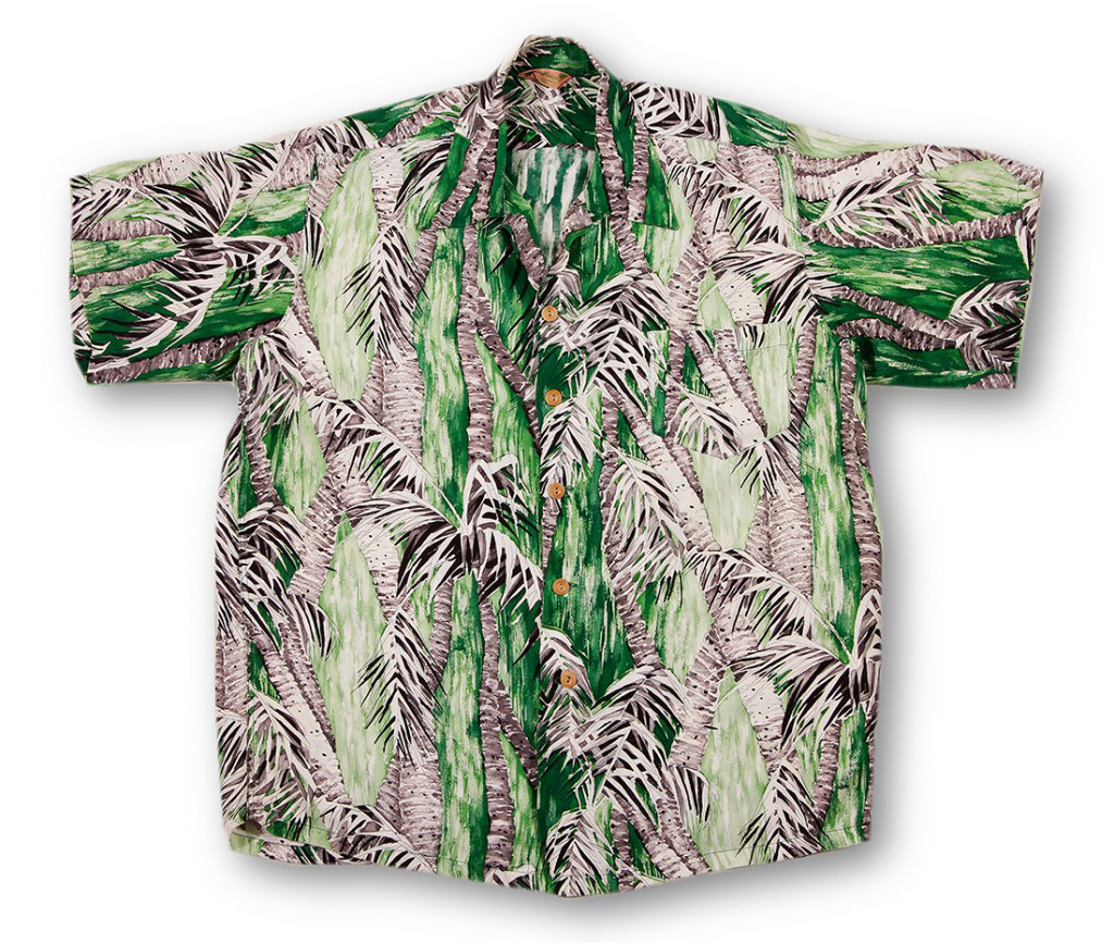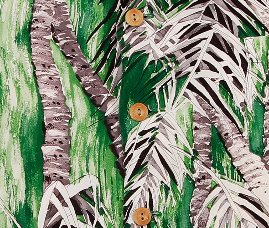 Tall palm trees grow tall on this well-designed, short-sleeved aloha shirt by Kamehameha. The colors are cleverly in reverse, with the truck and leaves a grayish brown and the background shades of healthy green. The details in the bark and leaves are intricate, giving this shirt an interesting texture.