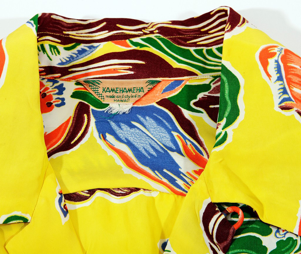 Banana trees, common in Hawaii, are believed to have been brought to the islands by early Polynesian voyagers navigating great sailing canoes. This fantastically well-painted design features several long banana leaves and banana flowers in various stages with clusters of young banana’s. A large amount of empty ground space allows each of the vibrantly colored elements to pop off the lively yellow ground.