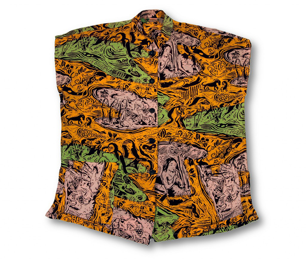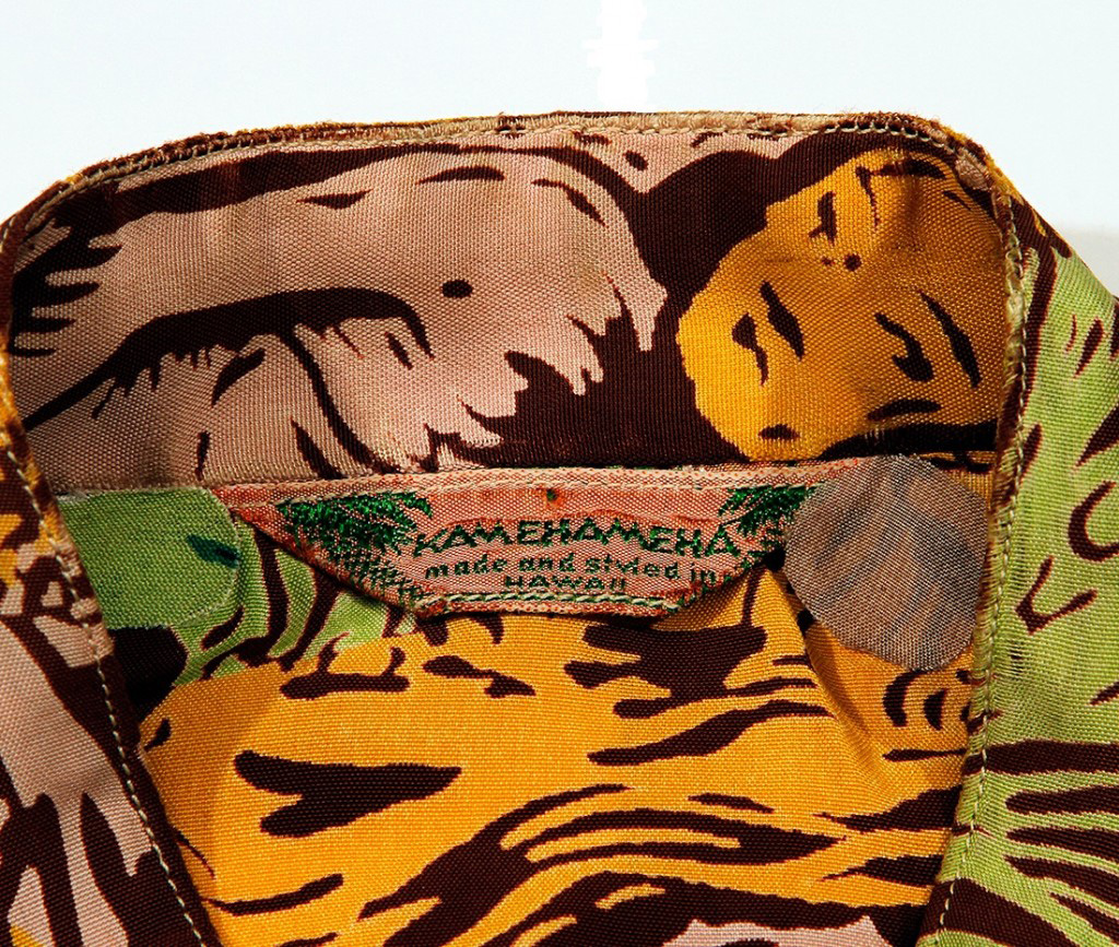 An unusual shirt in both design and style, this sleeveless aloha shirt by Kamehameha features faces and vignettes of Native Hawaiian women. The women are varied, from one stretching her face toward the sun to another hunched over her horse. This is one of those rare vintage aloha shirts designed specially for women, complete with an unfolded mandarin collar. The earthy tones of green, gold and brown complement the simple lifestyle of the scenes depicted here.