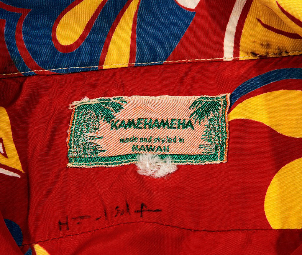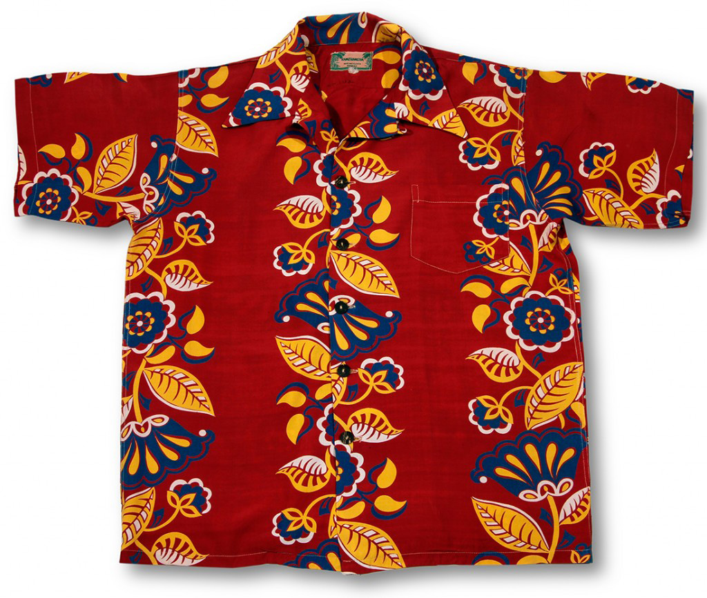 Both yellow leaves and royal blue flowers are vibrant against the deep red fabric of this Kamehameha aloha shirt. The floral patterns have an art deco feel, popular in the ’20s and ’30s in Hawai‘i. The linear pattern of intertwined leaves and flowers resemble a lei draped from the shoulders of the shirt’s wearer.