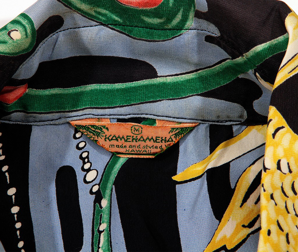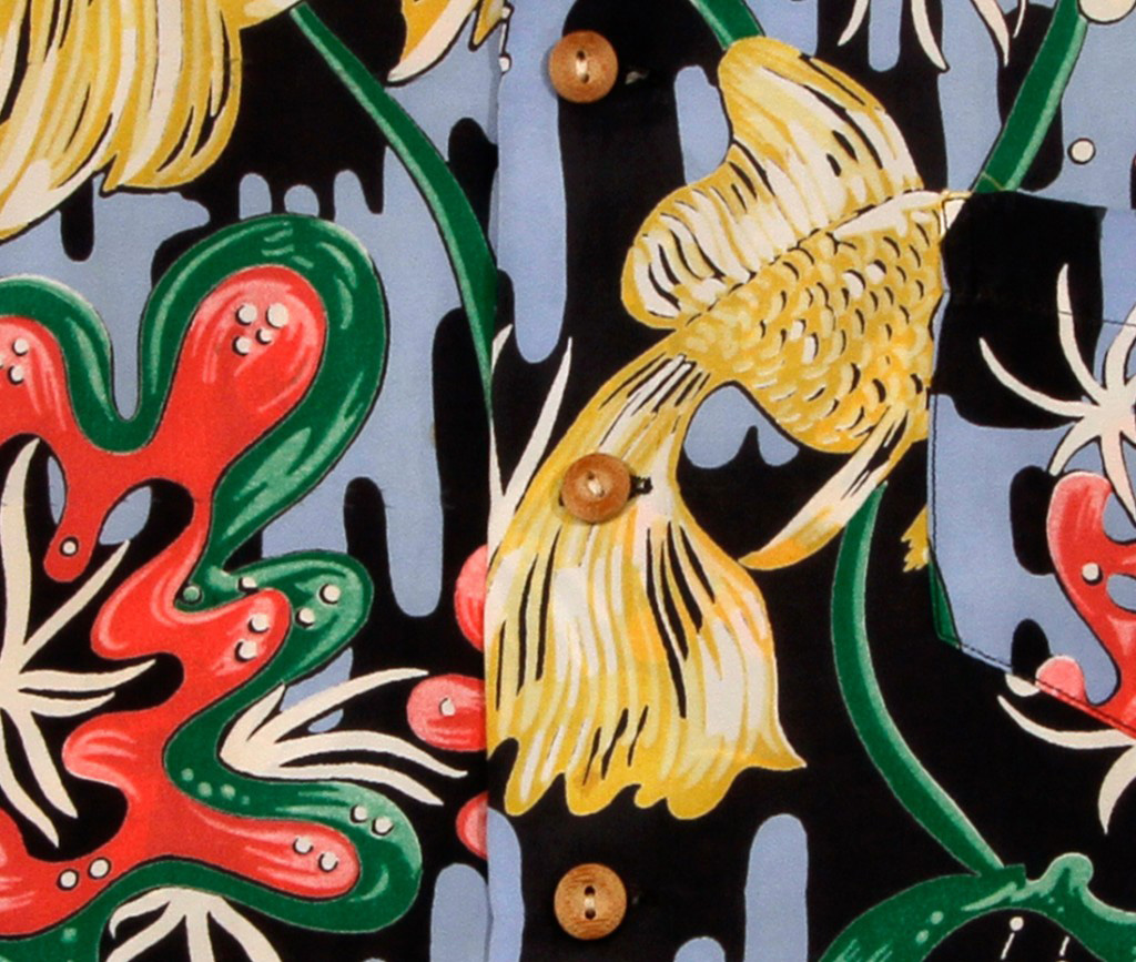An underwater dreamscape, this short-sleeved shirt by Kamehameha is dripping in blue and green sea plants. Hiding among the limu(seaweed), bright red coral and white spiny starfish are golden Siamese fighting fish, known as the betta, a popular aquarium species. These fish are native to the rice paddles, canals and floodplains in the Mekong basin of Thailand, Laos, Cambodia and Vietnam.