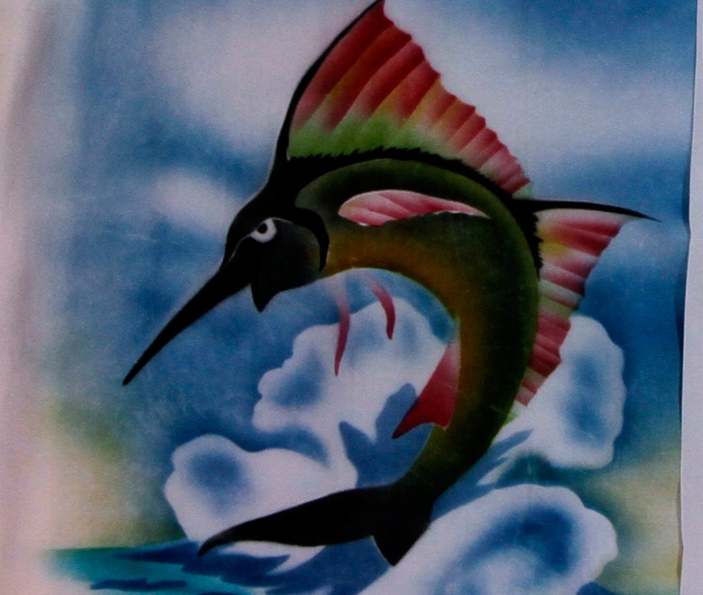 A vibrant sailfish comes completely out of a calm ocean on the west wide of Oahu. This shirt features a small version of the fish on the front right side and a large one dominating the back.