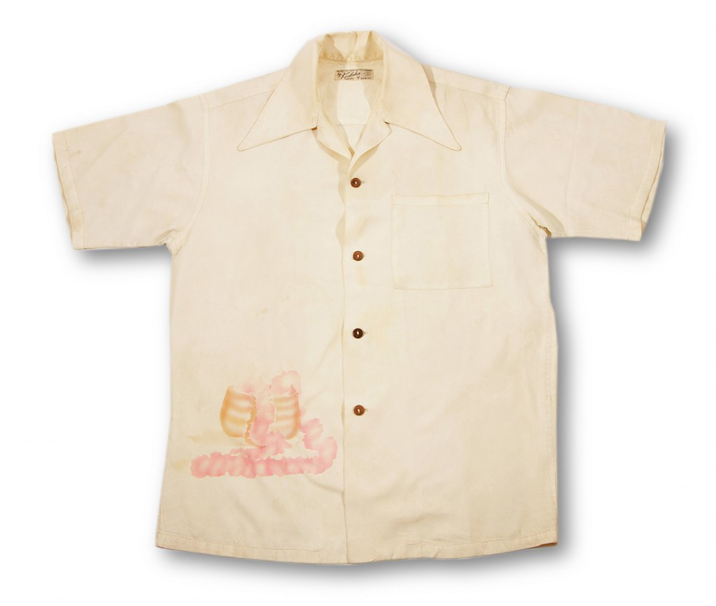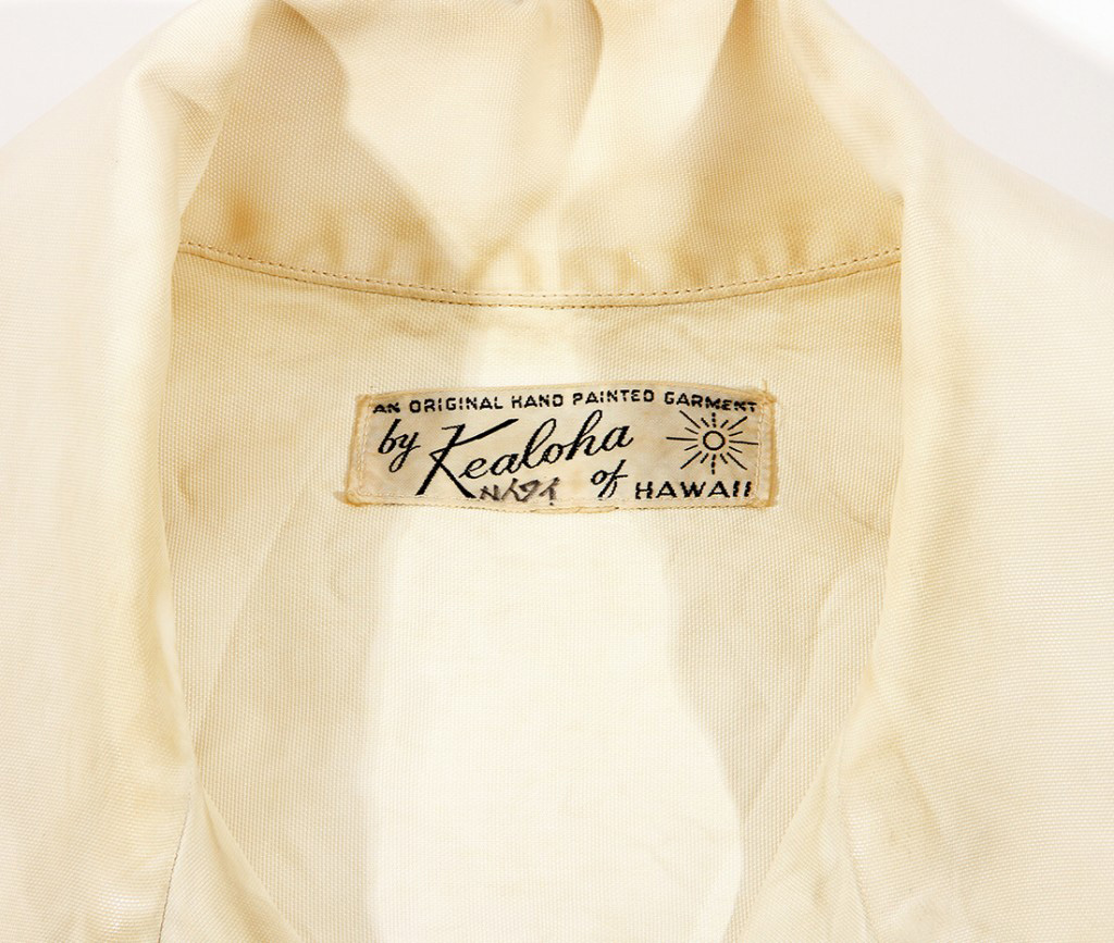 This short-sleeved aloha shirt by Kealoha of Hawaii is beautifully airbrushed to give the design a soft, delicate look. On the lower left corner is a small calabash out of which a pink double carnation lei flows. The colors are subtle and soft — a gorgeous statement on this cream canvas.