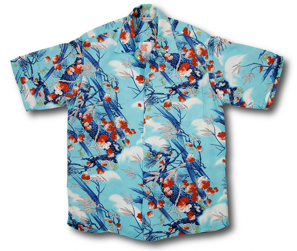 Bamboo and red-tinged maple leaves rustle in the chilly winter winds on this hand-painted aloha shirt by Kilohana. This shirt is a nod to the Asian-inspired designs popular during this time. The backdrop is an icy blue sky with tufts of white clouds, adding to the drama of this wintery landscape.