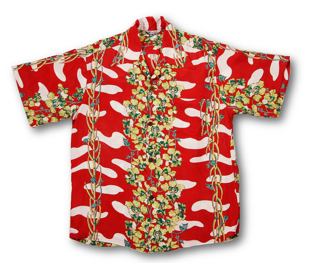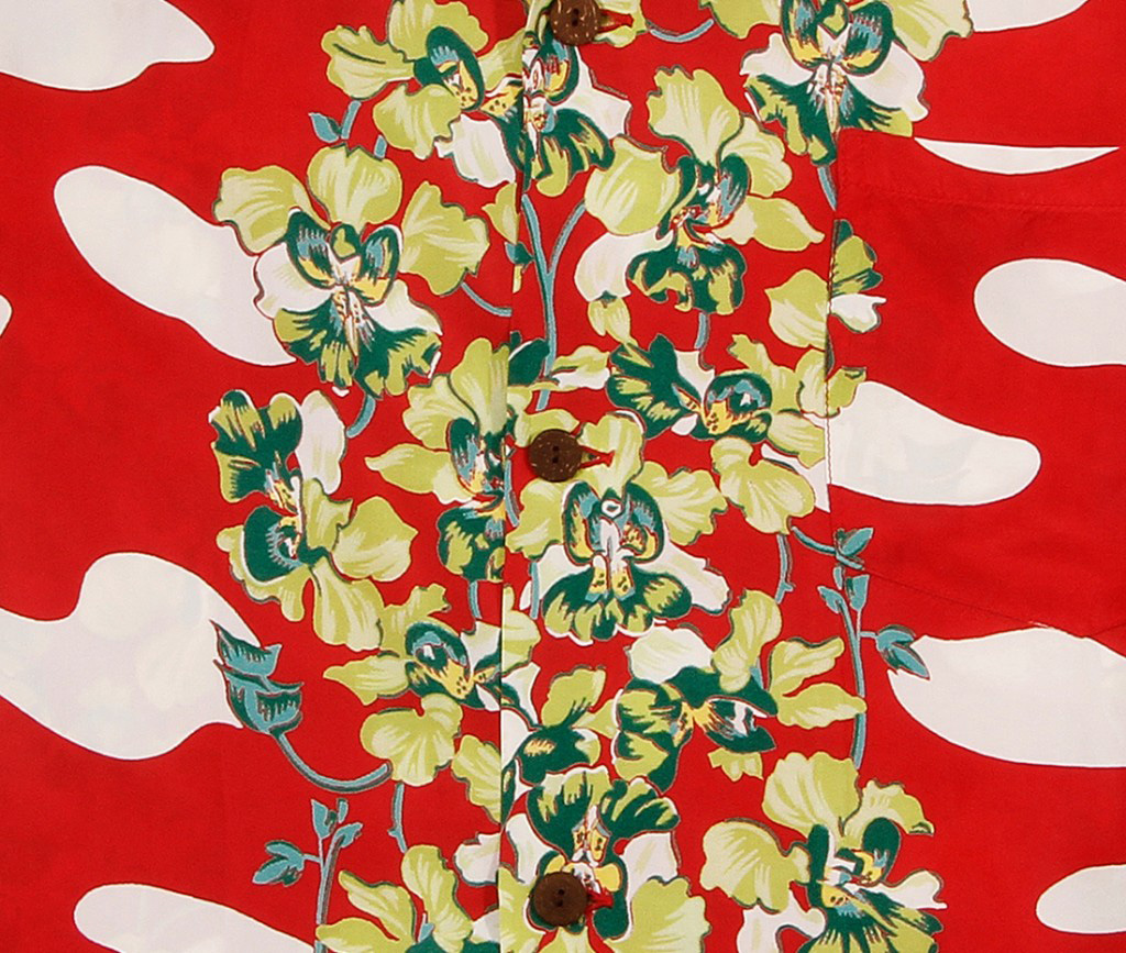 Vertical rows of gorgeous, hand-painted green cymbidum orchids flow down the center and along the sleeves of this bright red shirt, perfectly balanced by rows of turquoise and yellow jade vines with young buds on either side. White swirls fill in the space between flowers, adding more interest to this design.