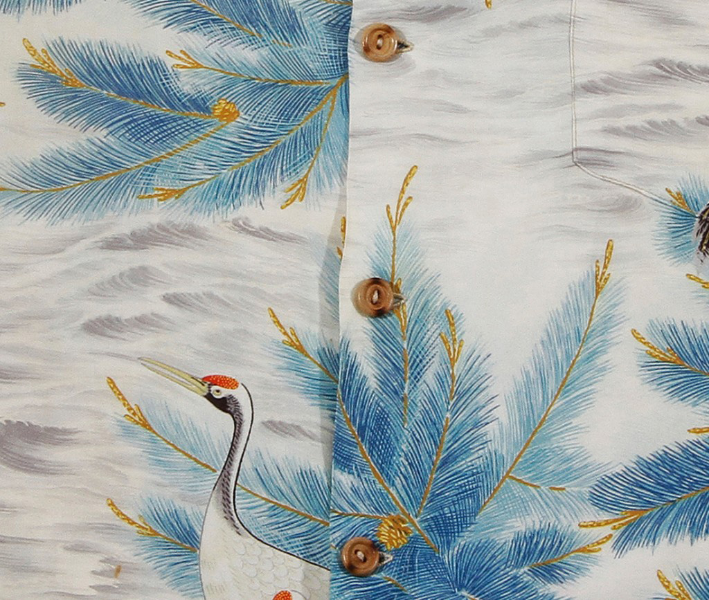 An unusual design with a soft background of shades of gray and vibrantly shaded blue pine branches with pairs Japan’s scared cranes, the Tsuru. In the pine branches there are occasional small pine cones.