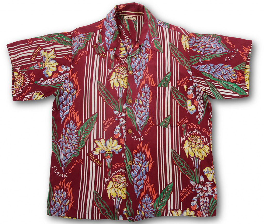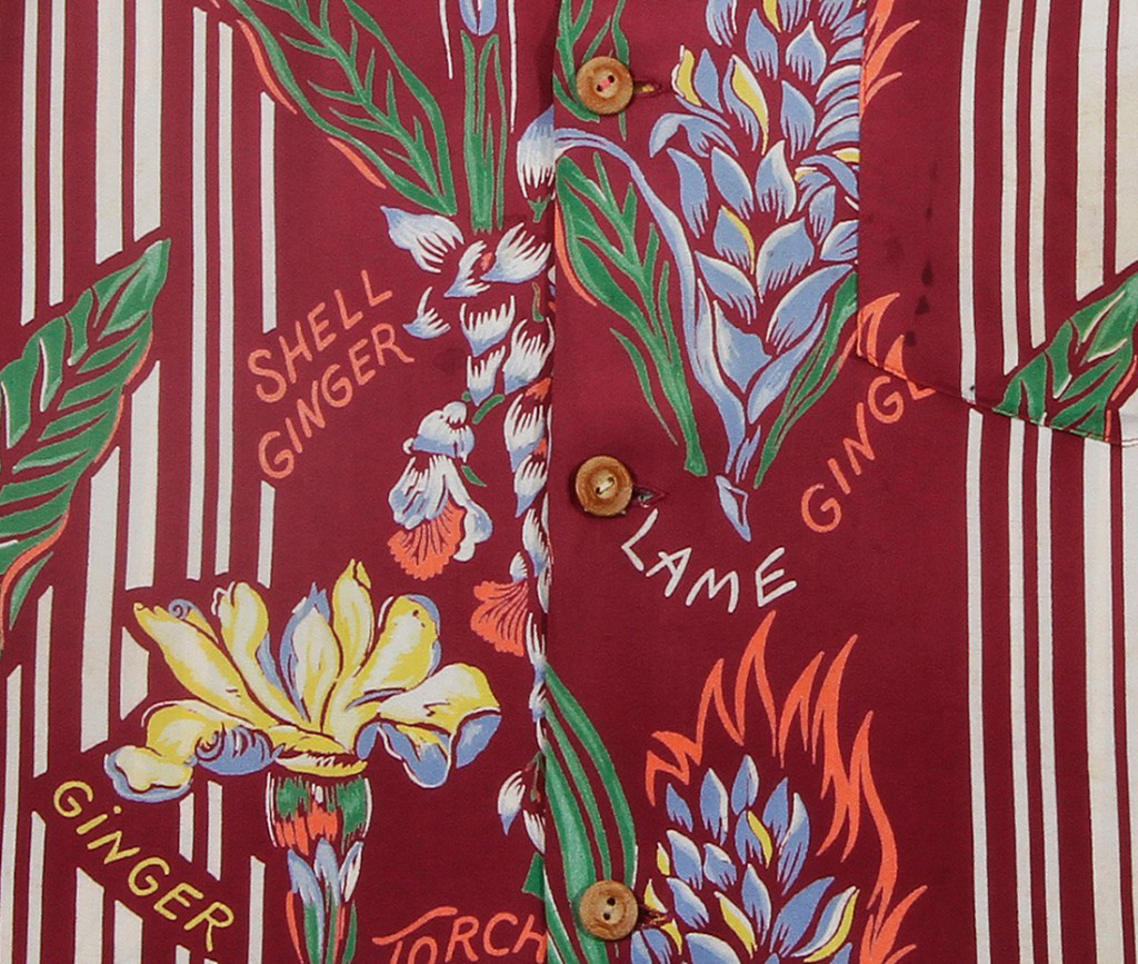This vertical, one-way print features various species of Hawaiian tropical ginger, shell ginger, flame ginger, and torch ginger. Between the rows of carefully hand painted ginger are white stripes that have been engineered to lay symmetrically on the shirts front, balanced and perfect, adding an uncommon dimension to the shirt. A flame has been added to the Red Ginger, also referred to as “flame ginger” in the old days.