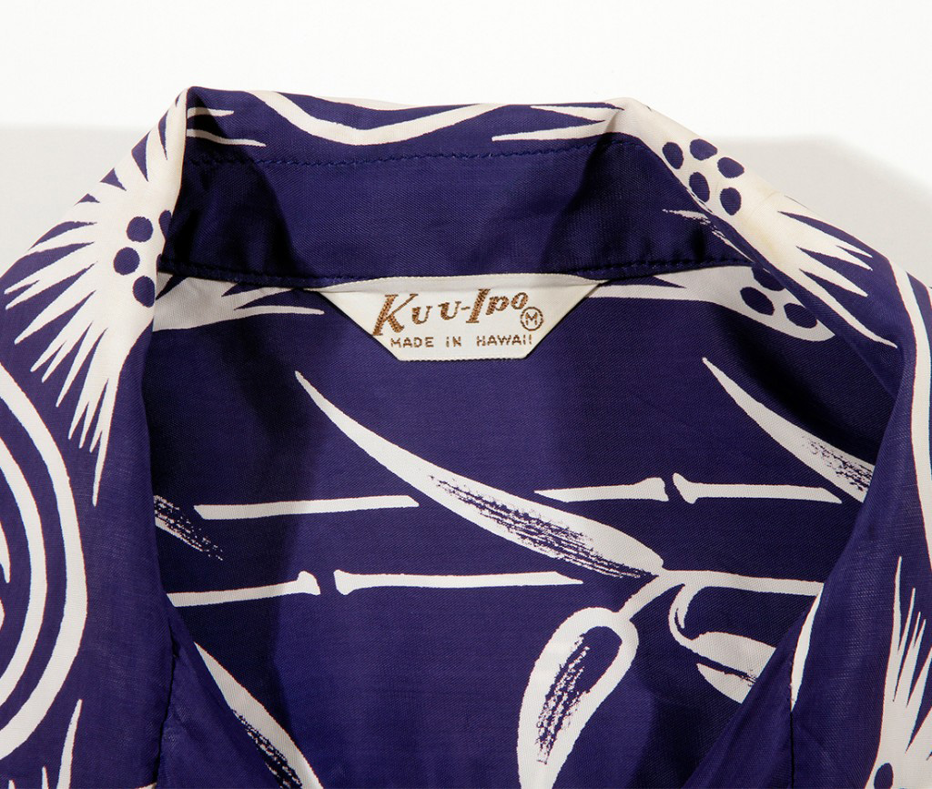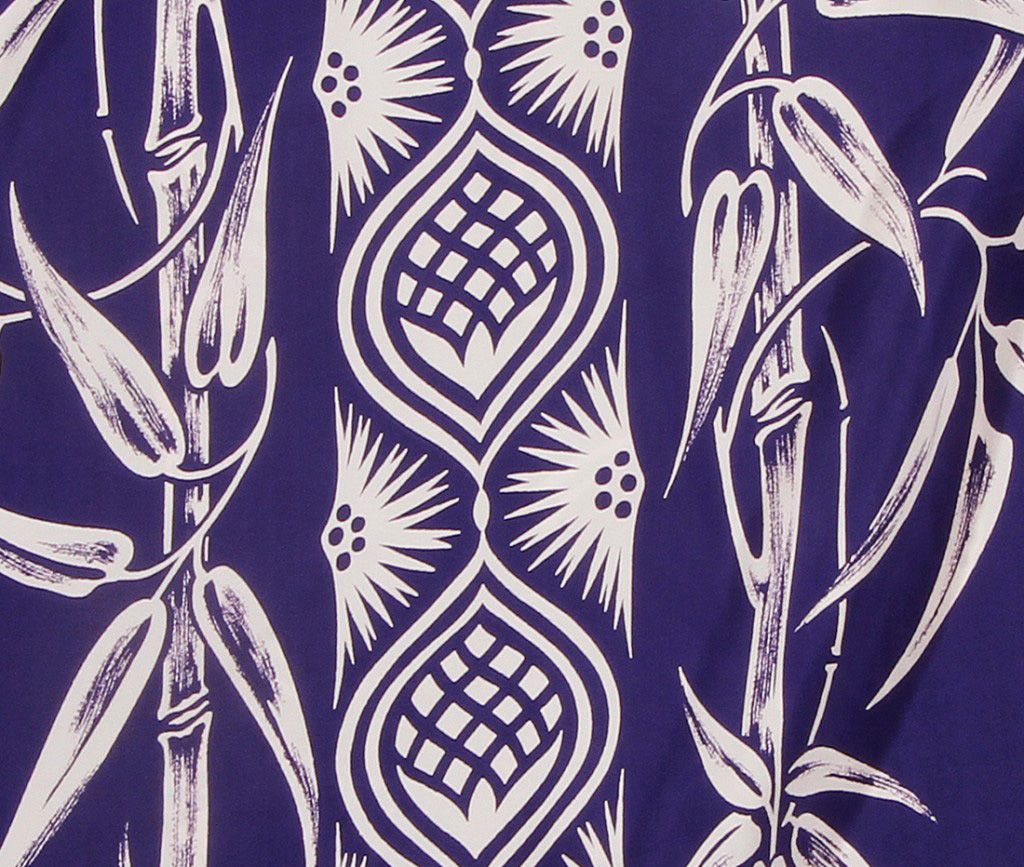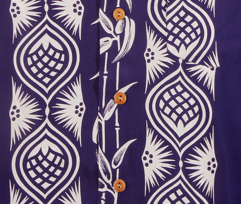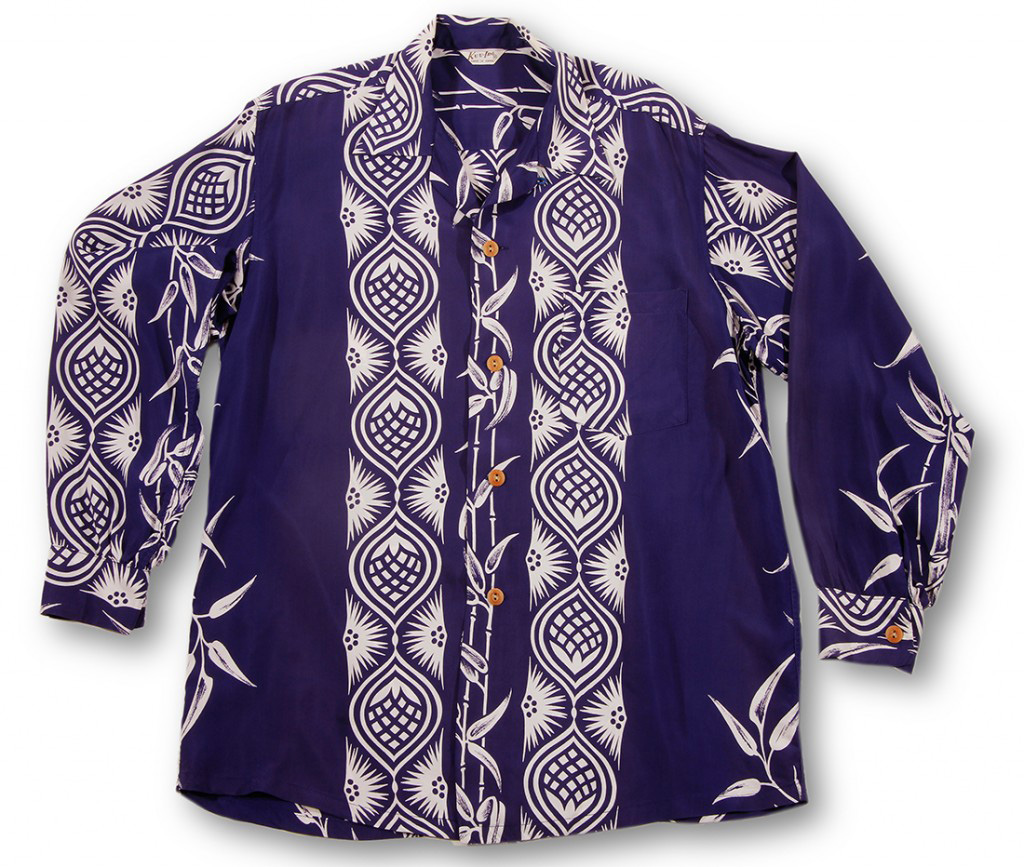 This elegant looking long sleeve Aloha Shirt would have been distinguished enough for any formal Hawaiian luau in the 1950’s. Out of a purple colored ground are stylized pine cones and seedlings in a vertical matching front with a row of thin bamboo going down the middle front and button area. On the back, two wider rows of bamboo flank the Pine inspired vertical stripe.