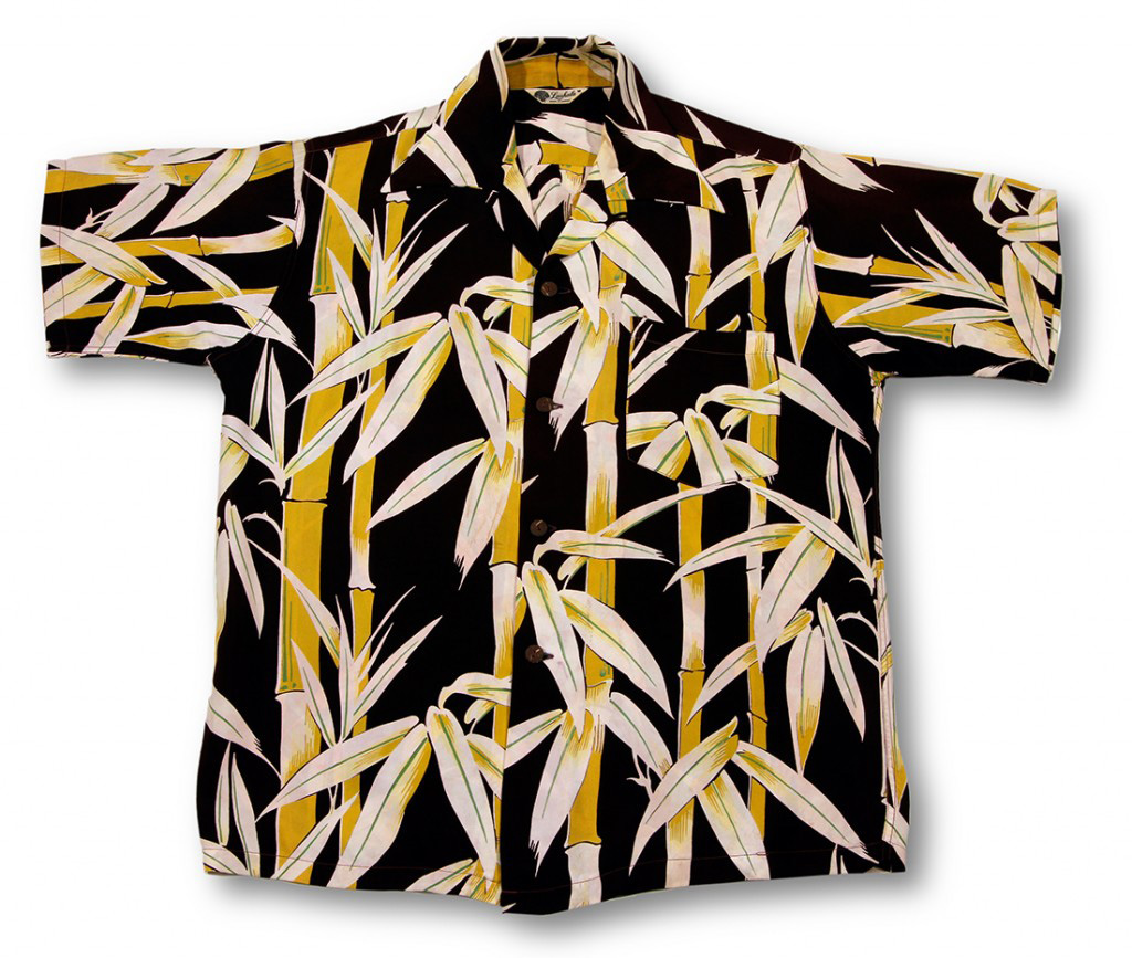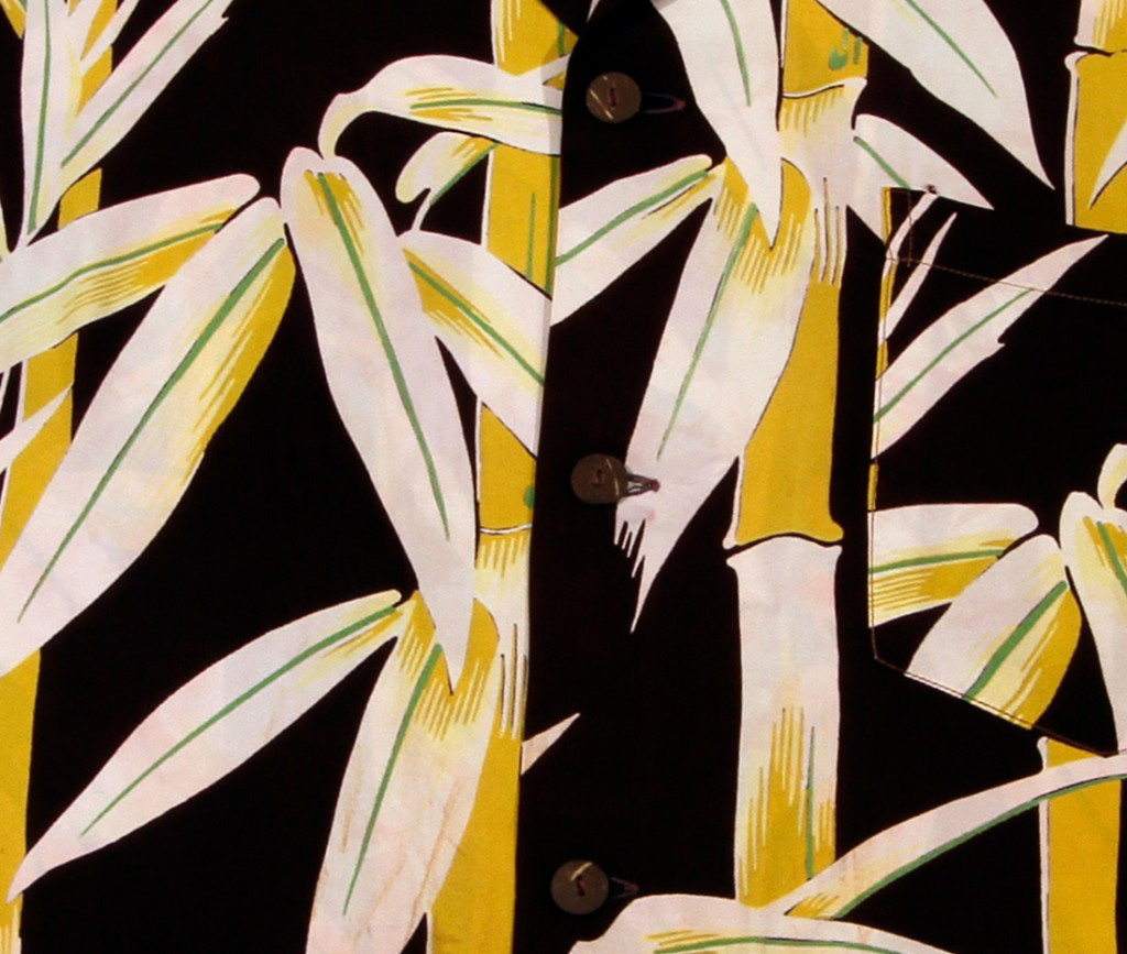 Golden bamboo rise from the bottom of this short-sleeved aloha shirt by Lauhala. The stalks and thin leaves pop off the black fabric, creating a more formal look to this casual shirt. The long life of the bamboo make it a Chinese symbol of uprightness, longevity and strength with flexibility.