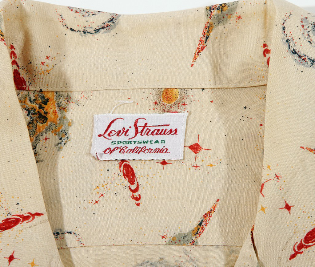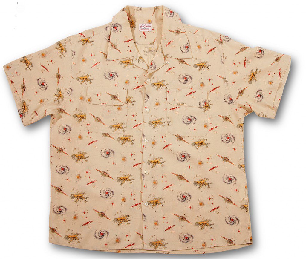 What looks better with an Aloha Shirt than a pair of jeans? Levi Strauss and many other large American clothing manufacturers produced relaxed shirts with prints, sometimes with a traditional Hawaiian feel and sometimes not. Here they were inspired by outer space, Saturn and swirling planets on a soft cream ground surrounded by light star dust.