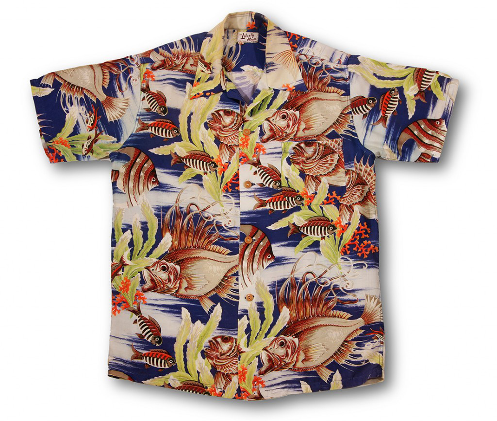 The one-way design on this short-sleeved aloha shirt by Liberty House features a bounty of tropical fish, like kihi kihi (moorish idols) and ala ihi (striped squirrelfish), swimming around the native limu (seaweed) and red coral in this underwater world.